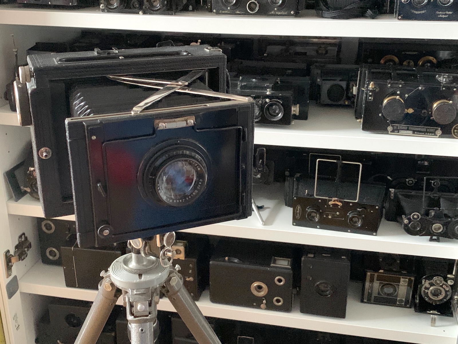 Ich habe den Kopf hier mal auf ein Gitzo-Stativ montiert und mit verschiedenen zeitgenössischen Kameras bestückt, hier einer Nettel 9x12. Die Kombination macht einen sehr soliden Eindruck, die schwere Kamera lässt sich bequem und präzise ausrichten und wackelt nicht.