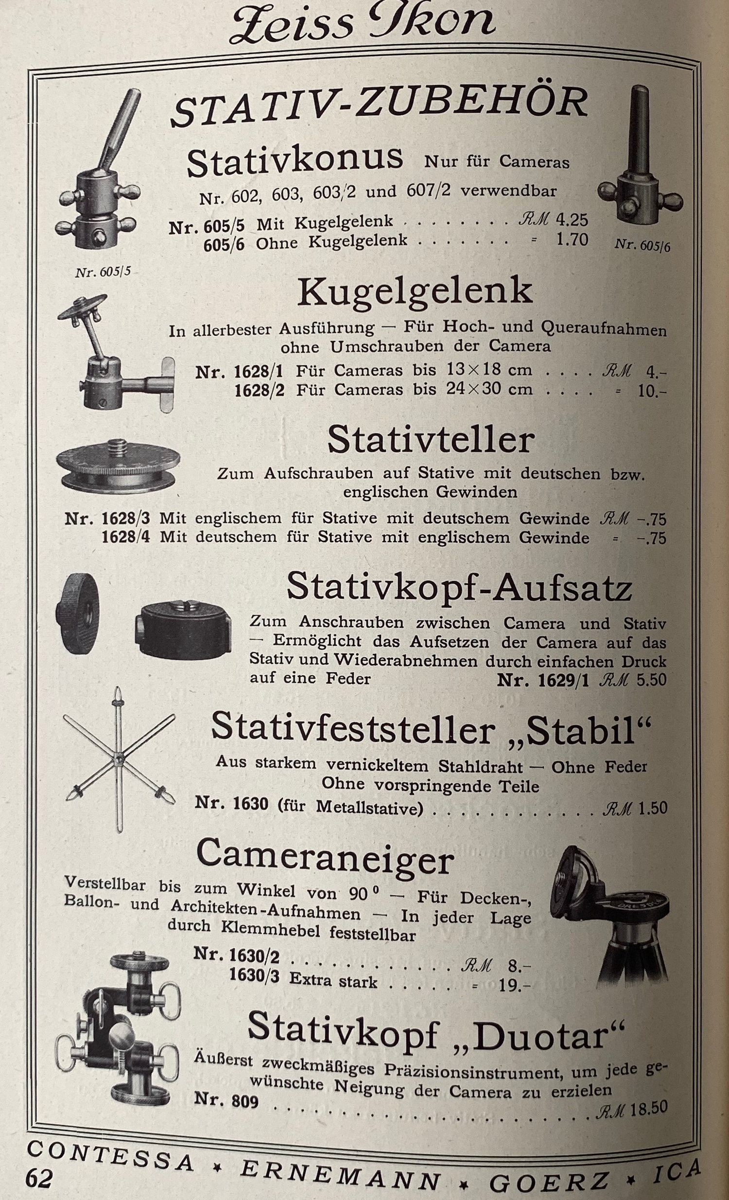Wie bereits erwähnt, wurde der Duotar 1926 mit der Bestell-Nr. 1629 in das Programm der Zeiss Ikon AG übernommen; interessanterweise ist es neben einem Kugelkopf und dem von der Ica übernommenen Camera-Neiger (--> https://blende-und-zeit.sirutor-und-comp...4&thread=32) der einzige Stativkopf.