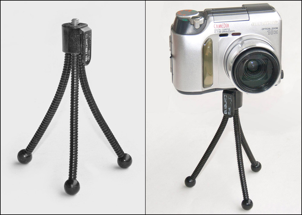 Das winzigkleine MINItripod von Carena leistet seit ca. 1980 oft einen guten Kamerastand bei längeren Belichtungszeiten oder bei Aufnahmen mit dem Selbstauslöser. Die Stabilität der biegsamen Beinchen reicht auch für kleine Digicams, wenn das Staivgewinde in der Mitte des Kamerabodens liegt.