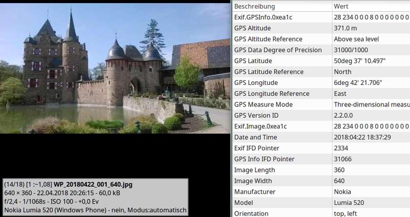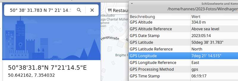Übrigens (ein Thread wie dieser hier soll ja lehrreich sein): auch heutige Digitalkameras bieten die Lösung, wenn sie GPS haben. Ich denke, Smartphone-Photo-Apps sind allgemein dafür vorkonfiguriert (mir fällt gerade ein, wann immer ich wieder mit einer analogen Kamera Bilder mache, daran zu denken, daß ich genau deswegen auch ein Foto mit dem Handy schieße). Einfach mit einem Bildbetrachter die Exif-Daten anzeigen lassen und die Zeilen mit den GPS-Daten suchen. Bei Irfanview wäre es "Bild-Informationen" und auf den "Exif" Button klicken. Diese in Google Maps gemäß https://support.google.com/maps/answer/1...tform%3DDesktop formlos in's Suchfeld eintragen, ohne Abstände, mit °, ' und " dahinter sowie z.B. N oder E dahinter. Die zwei Koordinaten mit 1 Abstand trennen. Schon wird der Aufnahmestandpunkt auf Google Maps angezeigt. Das Bild zeigt einen Ausschnitt aus Google Maps, das bekannte Suchfeld, überlagert von einem Ausschnitt aus der Exif-Anzeige meines Bildbetrachters.