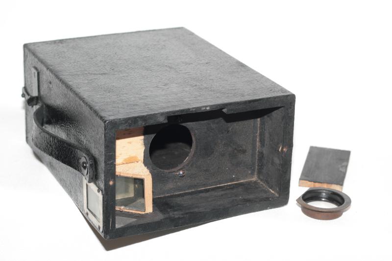 *) beachtlich ist auch das "Bajonett" des "Objektivs", bestehend aus zwei Holzschrauben - daß das Objektiv an seinem Platz gehalten gehalten wird, wird übrigens auch durch das lose Brettchen bewirkt, das nach dem Einsetzen des Objektivs und vor Anbringen des vorderen Bretts eingesetzt wird. Letzteres Brett sichert wiederum das Brettchen in seiner Lage, wenn es denn genau paßt. Der Konstrukteur hat sich zweifellos bewußt eine möglichst günstig und einfach herstellbare Kamera überlegt.