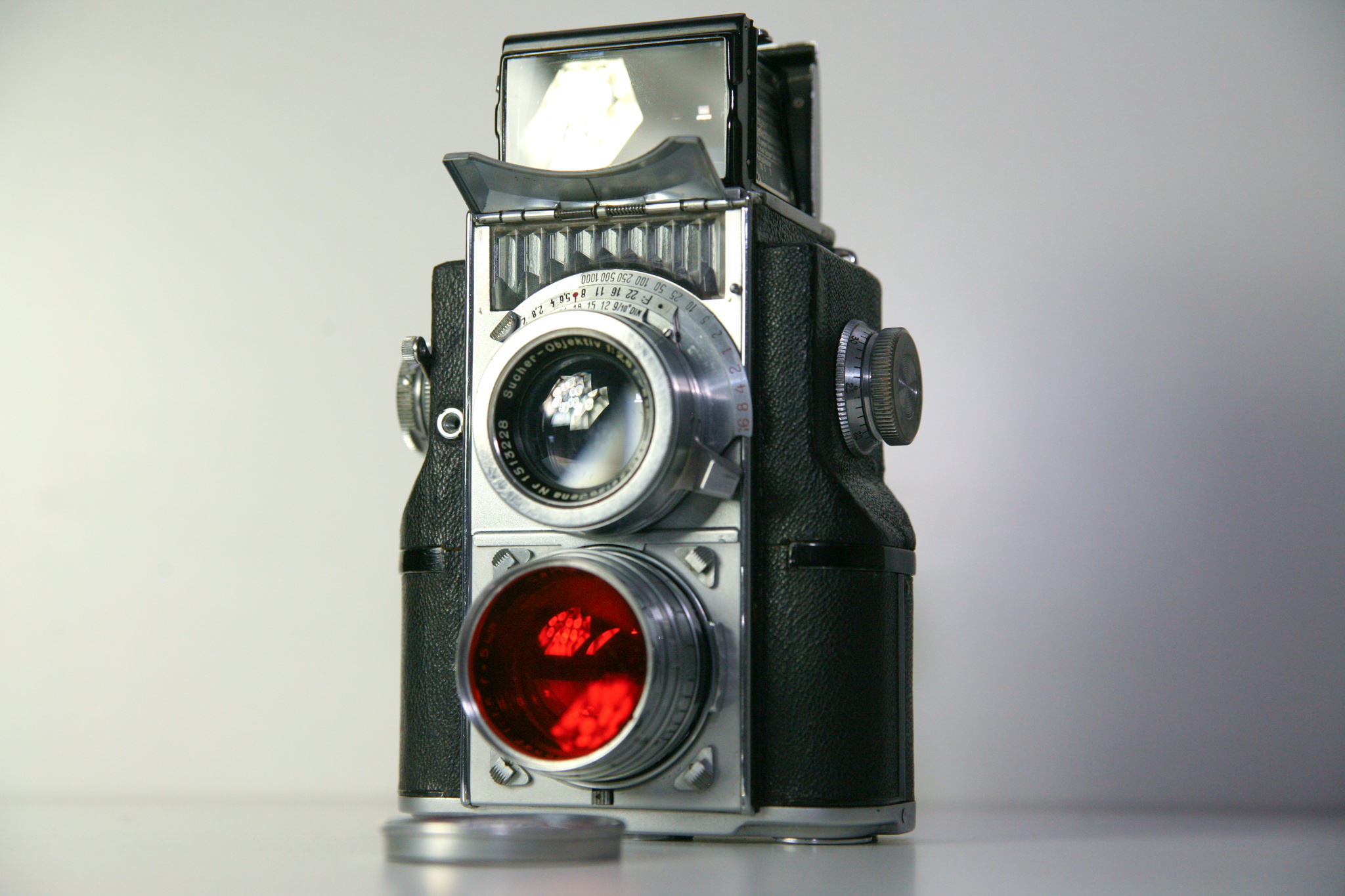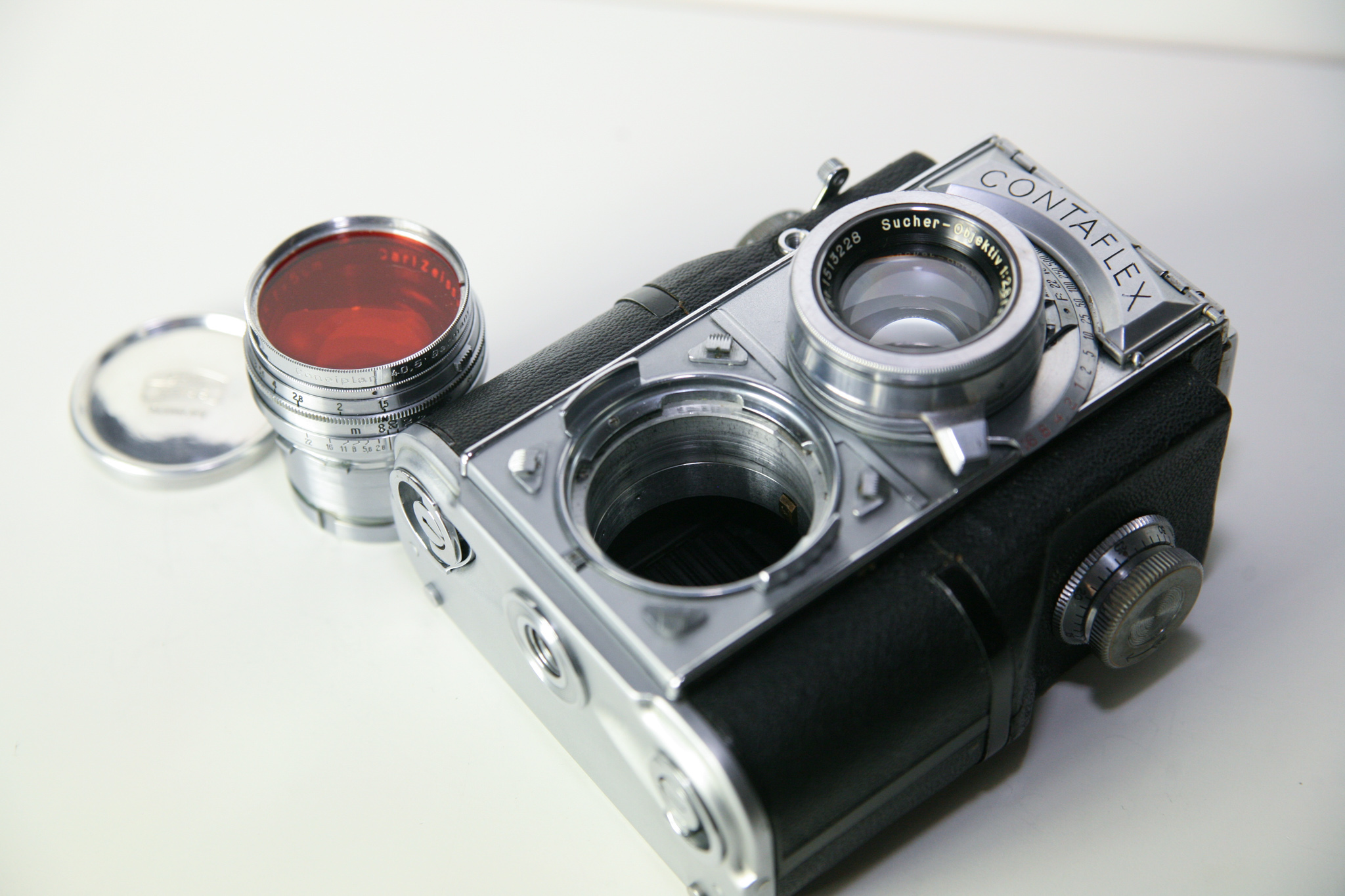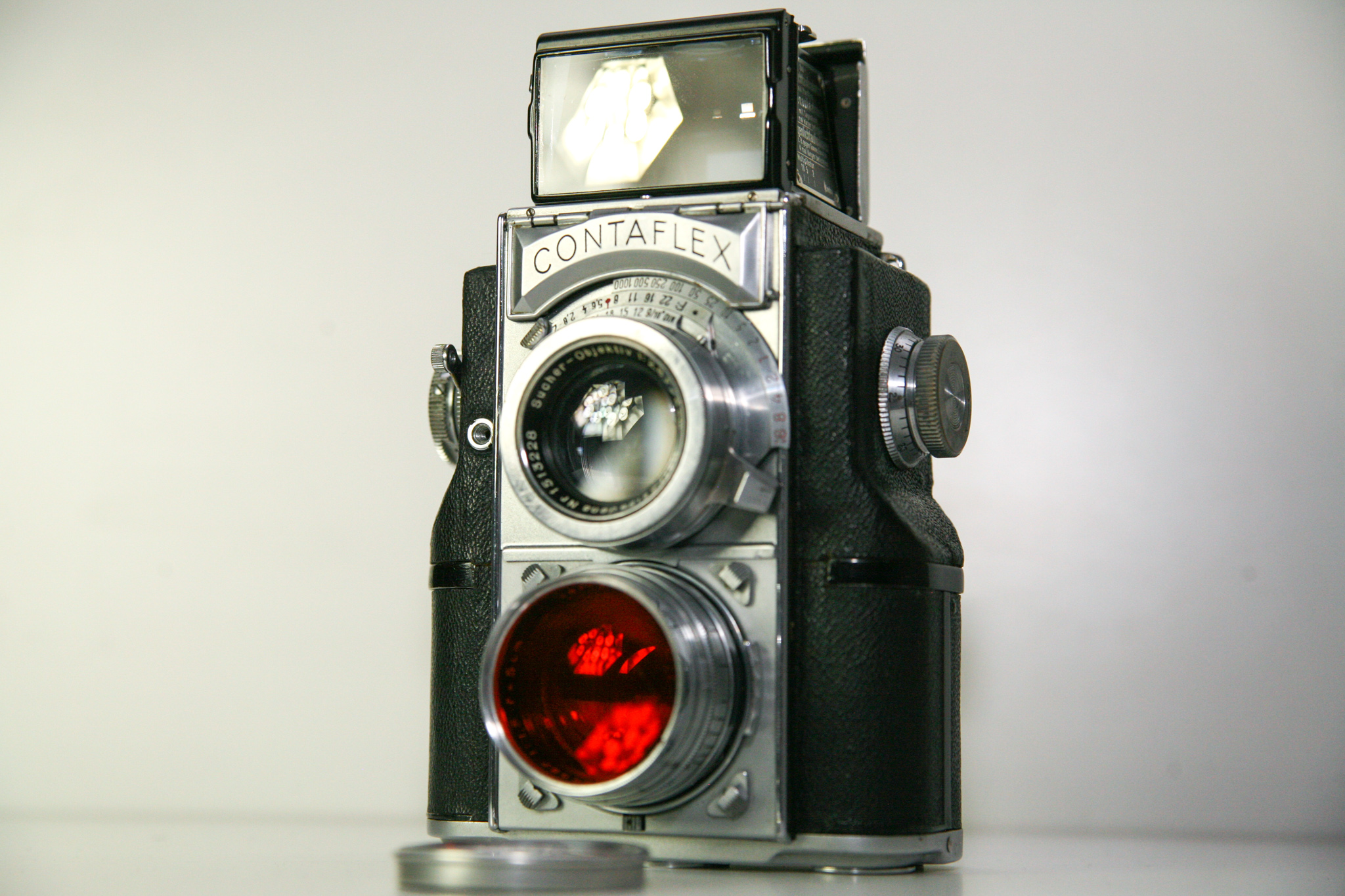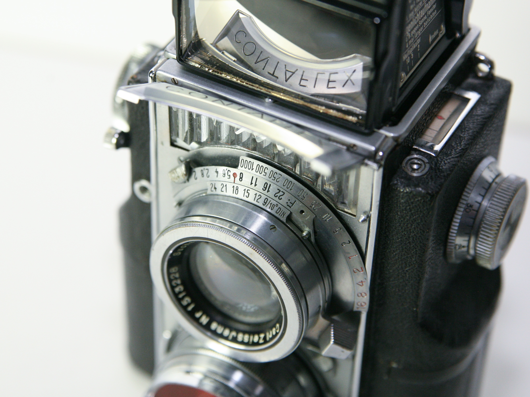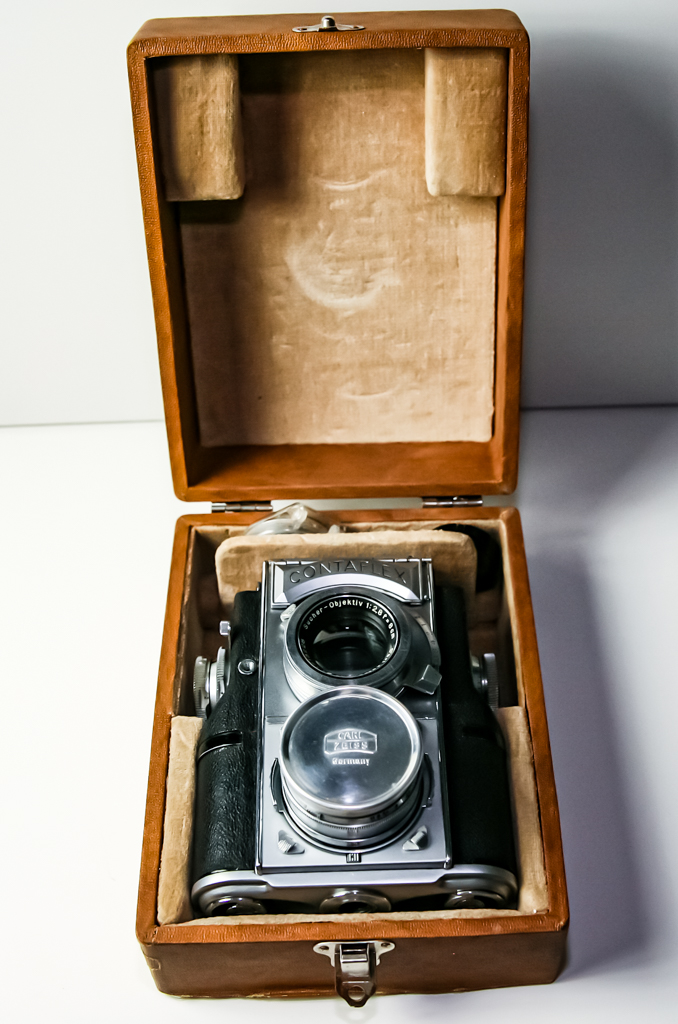 hier nun die Zeiss Contaflex TLR (860/24). Hergestellt wurde sie ab 1935 bis Anfang der 40er Jahre. Es wurden nur 4000-5000 Stück hergestellt, wovon heute nur noch ca. 2500 Stück existieren. Sie war eine Meisterleistung deutscher Ingenieurskunst. Sie war so kompliziert Aufgebaut, das es heute kaum noch jemand gibt, der sich an eine Reparatur der Kamera wagt. Die ist auch der Grund, warum es kaum Kameras in funktionierendem Zustand gibt. Mein Model wurde 1986 in München von einem Spezialisten komplett Überholt. Der Preis dafür lag bei unglaublichen 2600.-DM ! Das ist heute immer noch so, die Reparatur der Kamera kostet mehr, als die Kamera selbst.