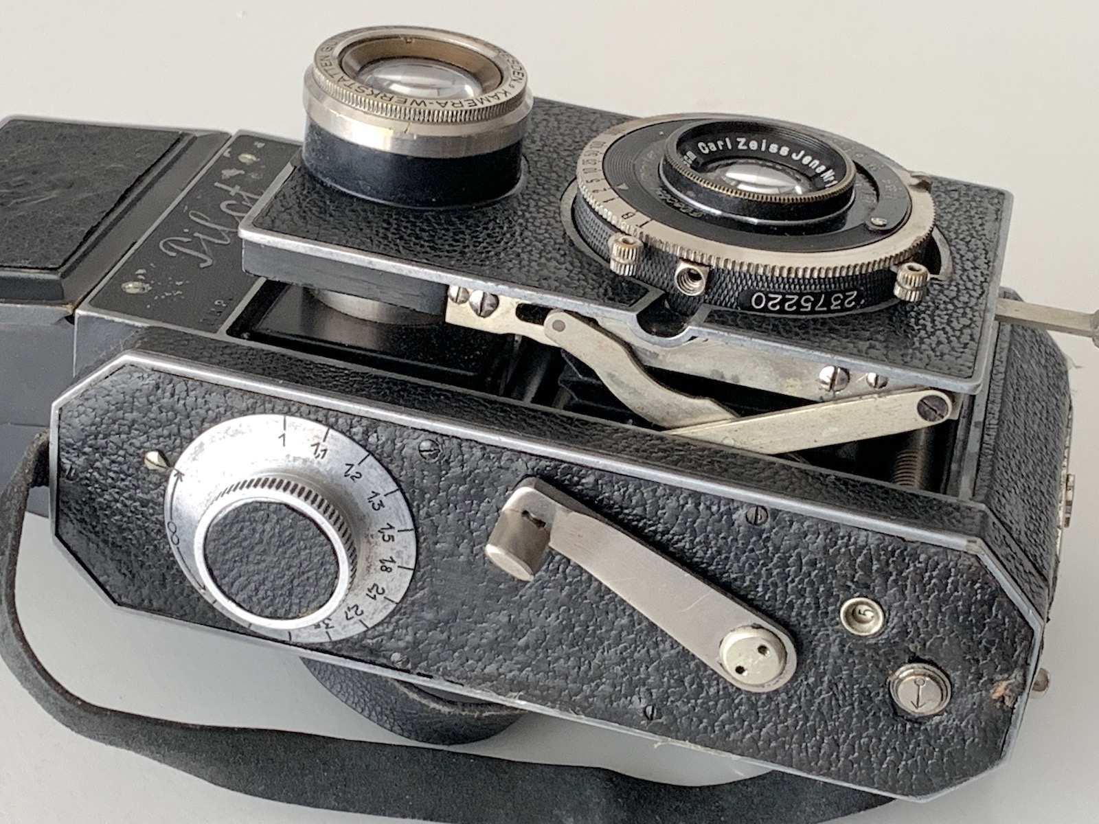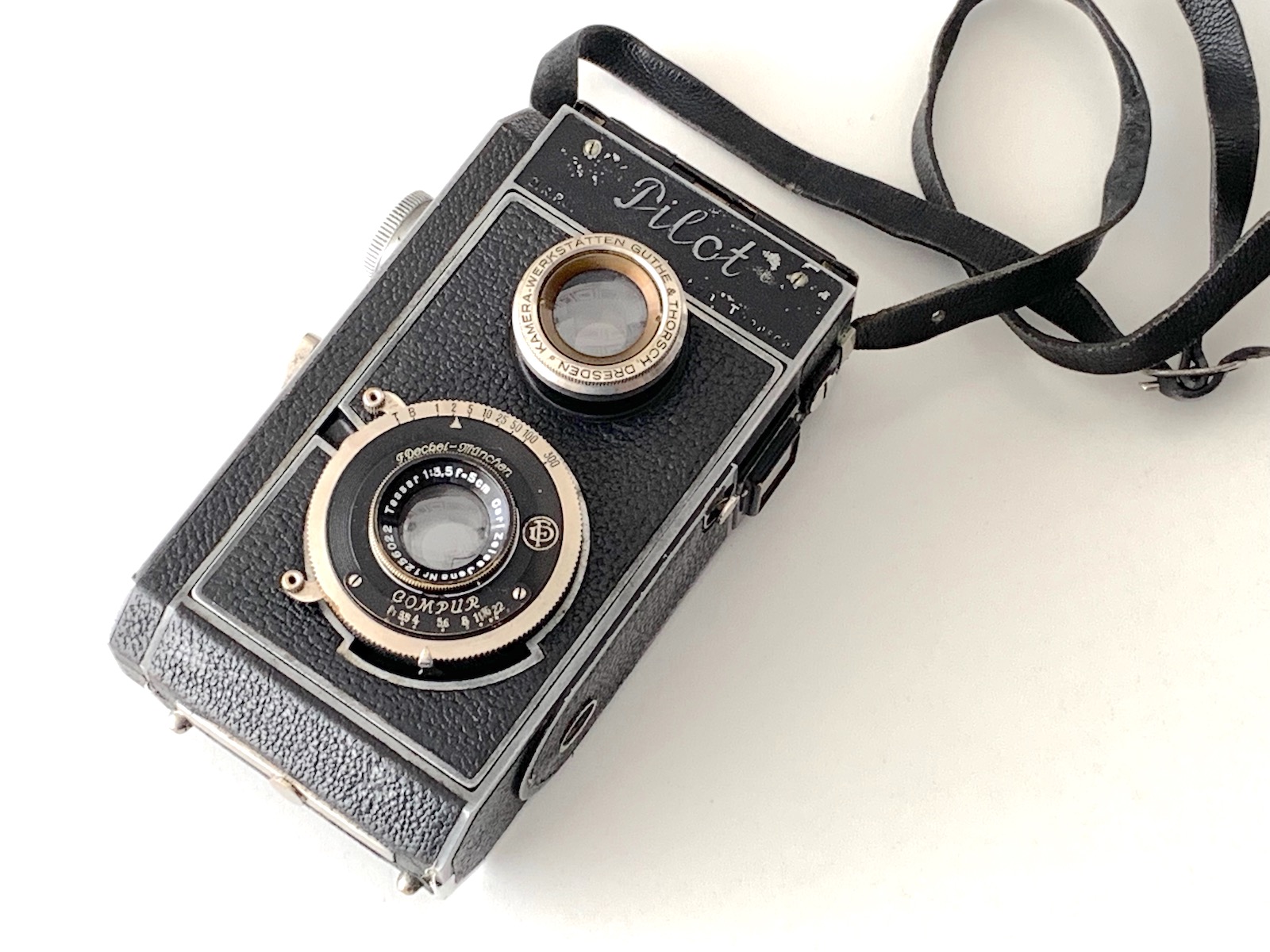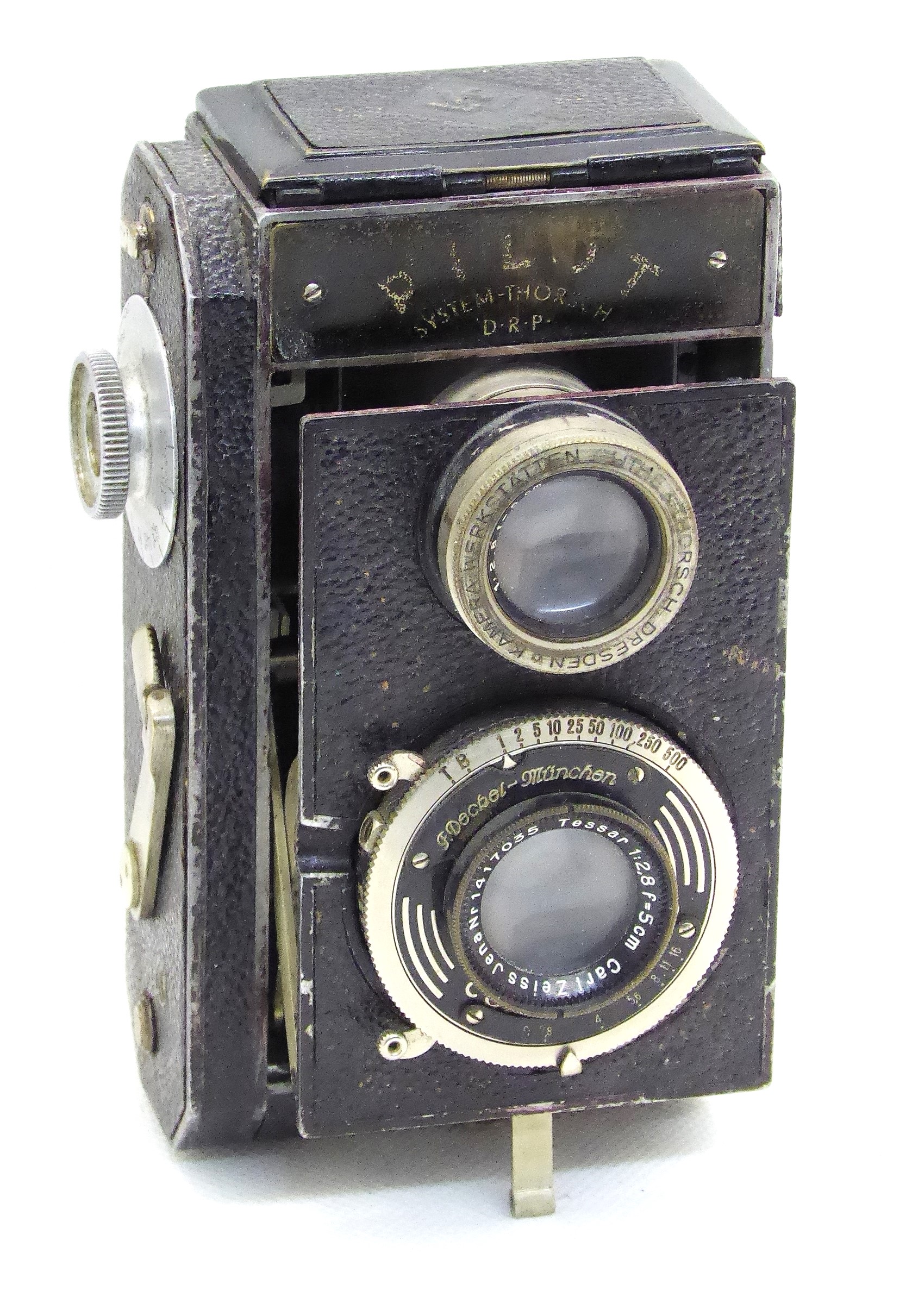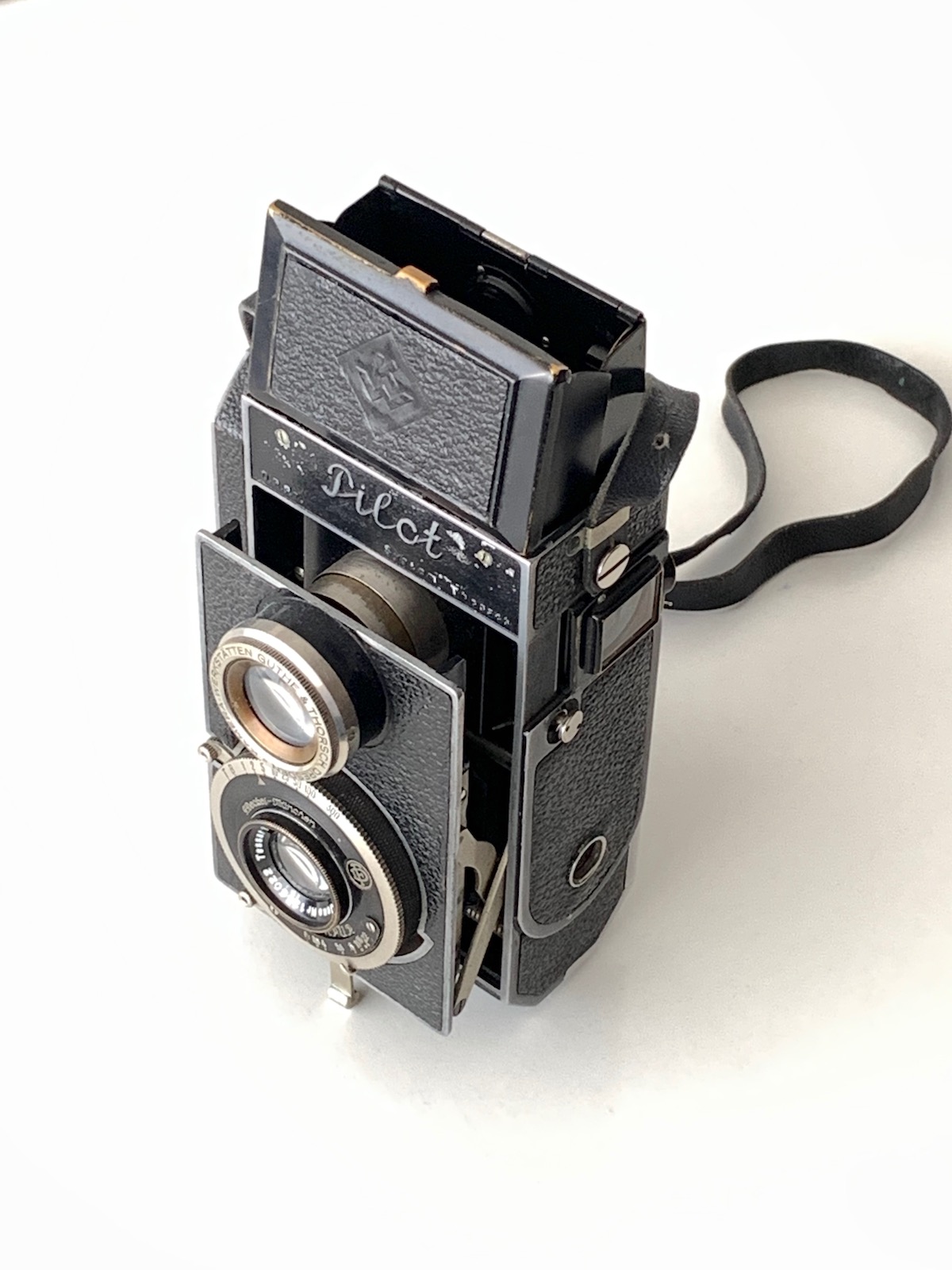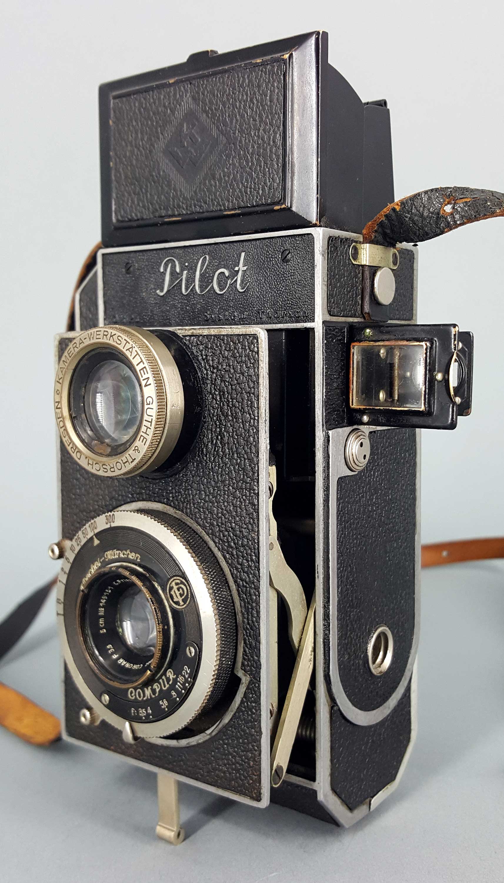 hier eine TLR für das 'Kleinbildformat' 3x4 cm, das in den frühen 1930er Jahre populär war: Eine Pilot (manchmal auch Pilot-Reflex genannt) der Kamera-Werkstätten Guthe & Thorsch, Dresden.