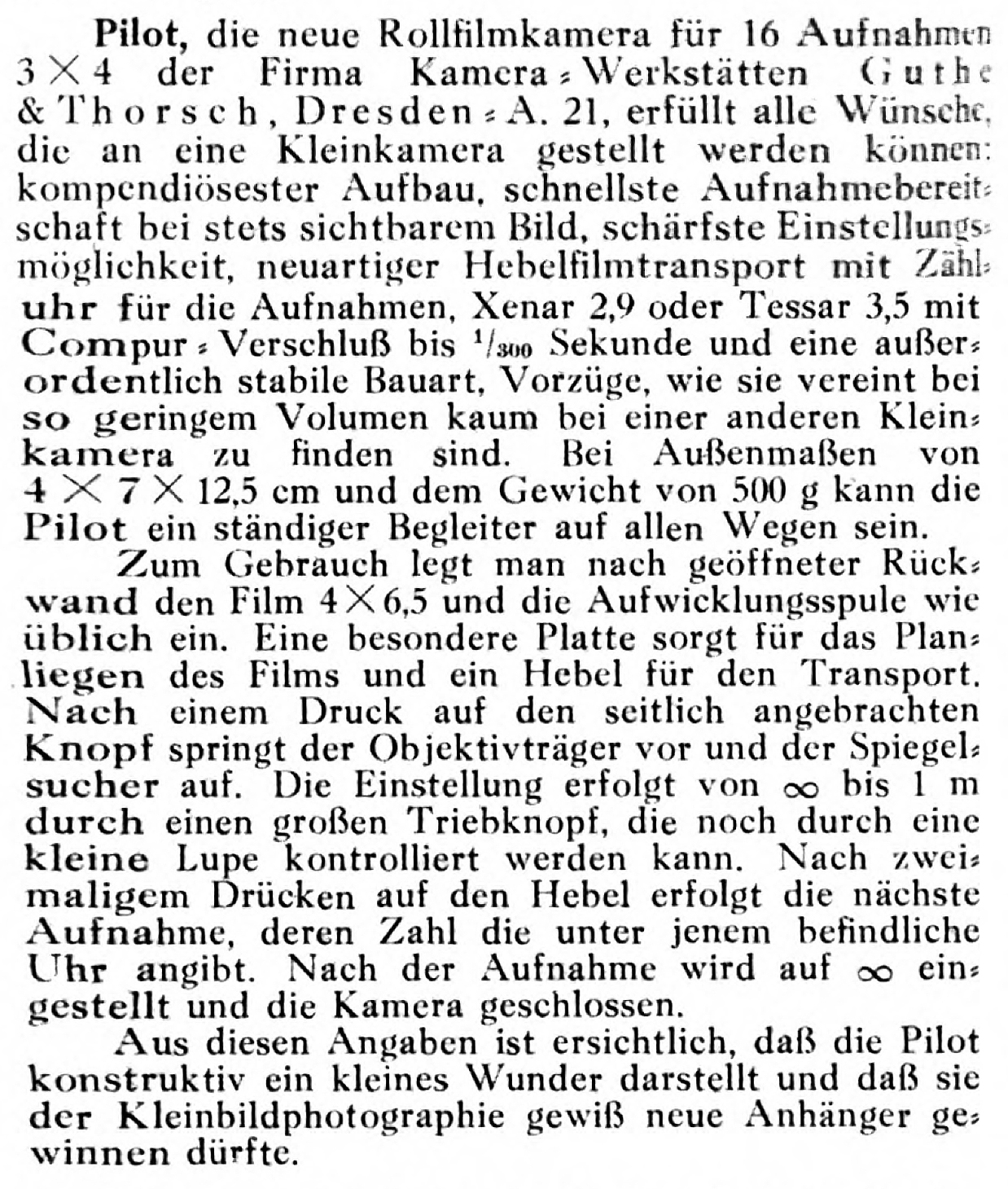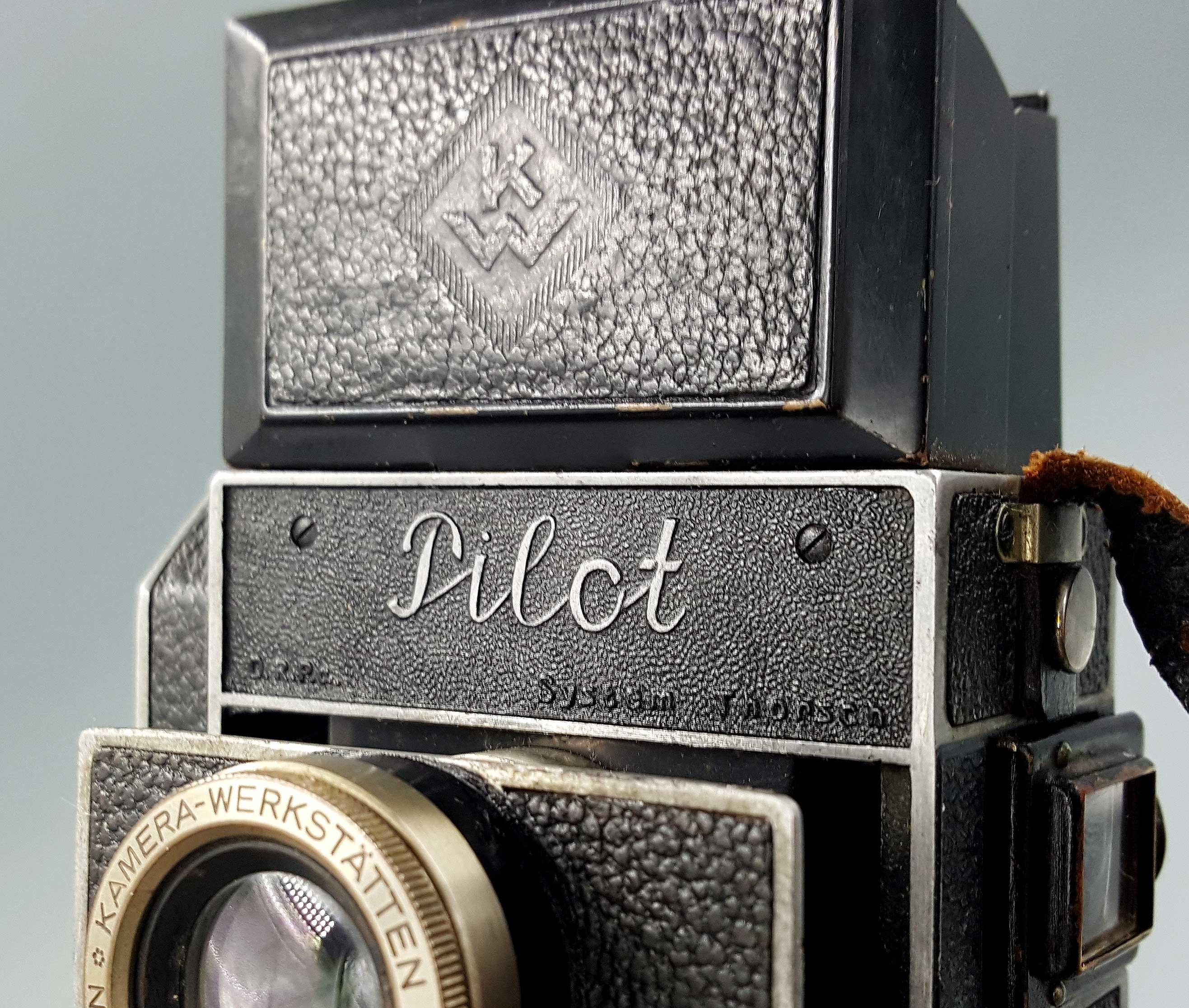 Weil bei normaler Kamerahaltung ein Querformat belichtet wird und Hochformataufnahmen zu Verrenkungen führen würden, gibt es seitlich einen optischen Sucher, mit dem Hochformataufnahmen aus Augenhöhe möglich sind. Die Pilot wurde ab etwa 1931 angeboten; im Katalog 1931 von Photo-Matthias (Dresden) kostet sie in dieser Ausführung 193,50 RM.