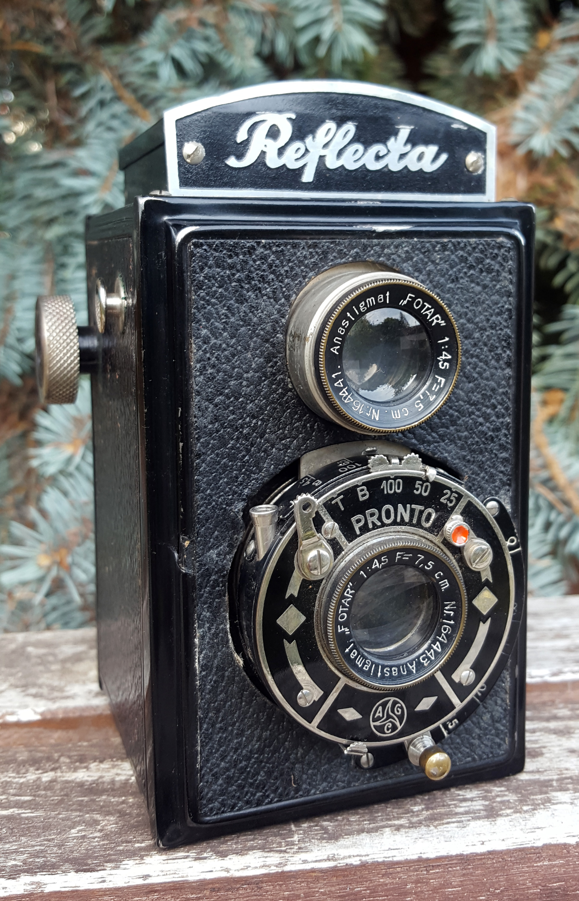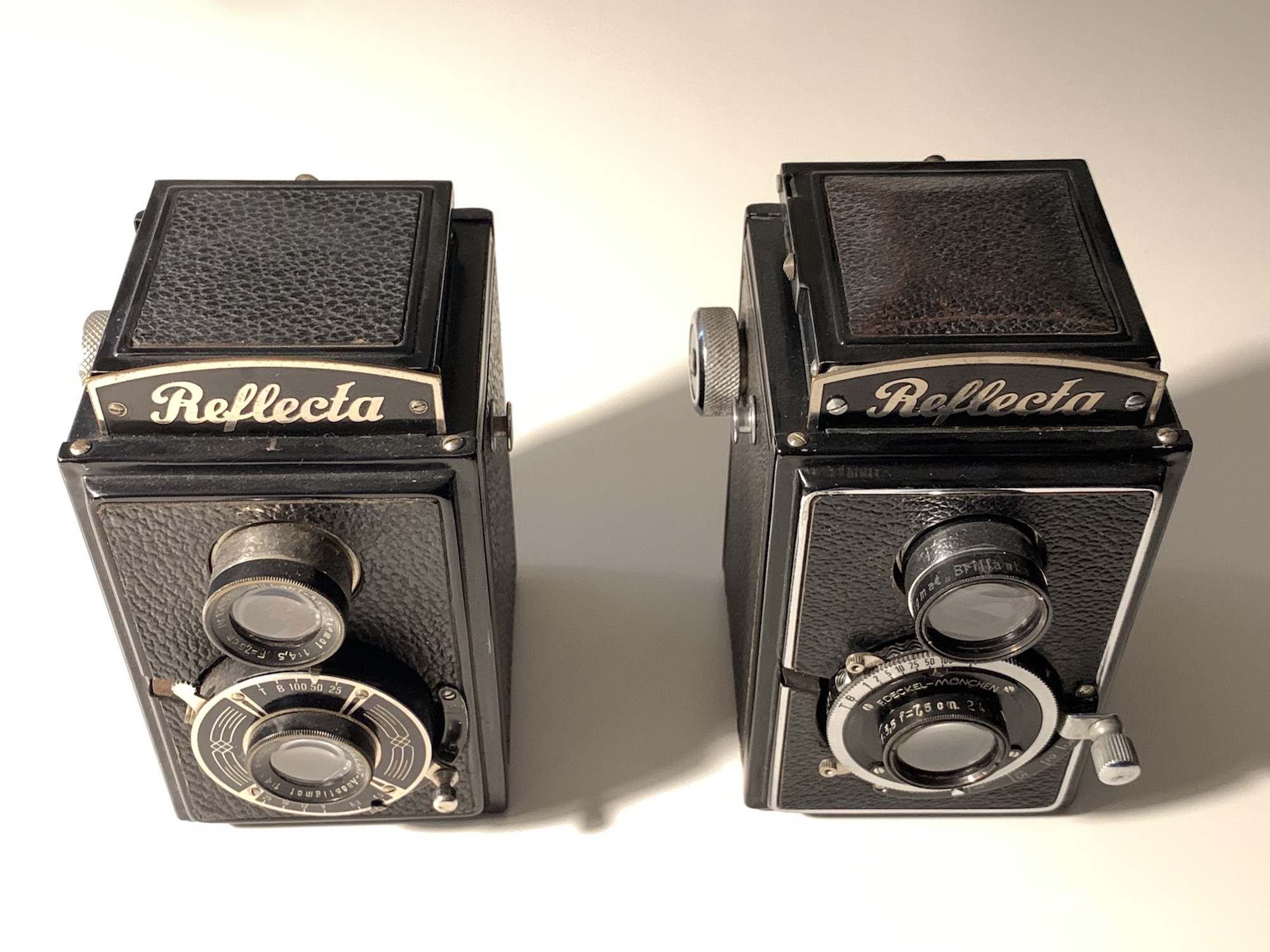 verschiedene Reflektas (K und II) wurden ja schon vorgestellt. Hier haben wir nun einen Urvater der Reflektas (und der Weltaflex): die Reflecta vom Kamera-Werk C. Richter Tharandt. Die Entwicklung dieser Kamera begann 1930 im ‚Camera Werk Ferdinand Merkel Tharandt‘. Nachdem Merkel 1932 Konkurs anmelden musste übernahm Fritz Richter mit seiner Frau Charlotte das Werk und führte auch die Entwicklung dieser zweiäugigen Spiegelreflexkamera weiter.