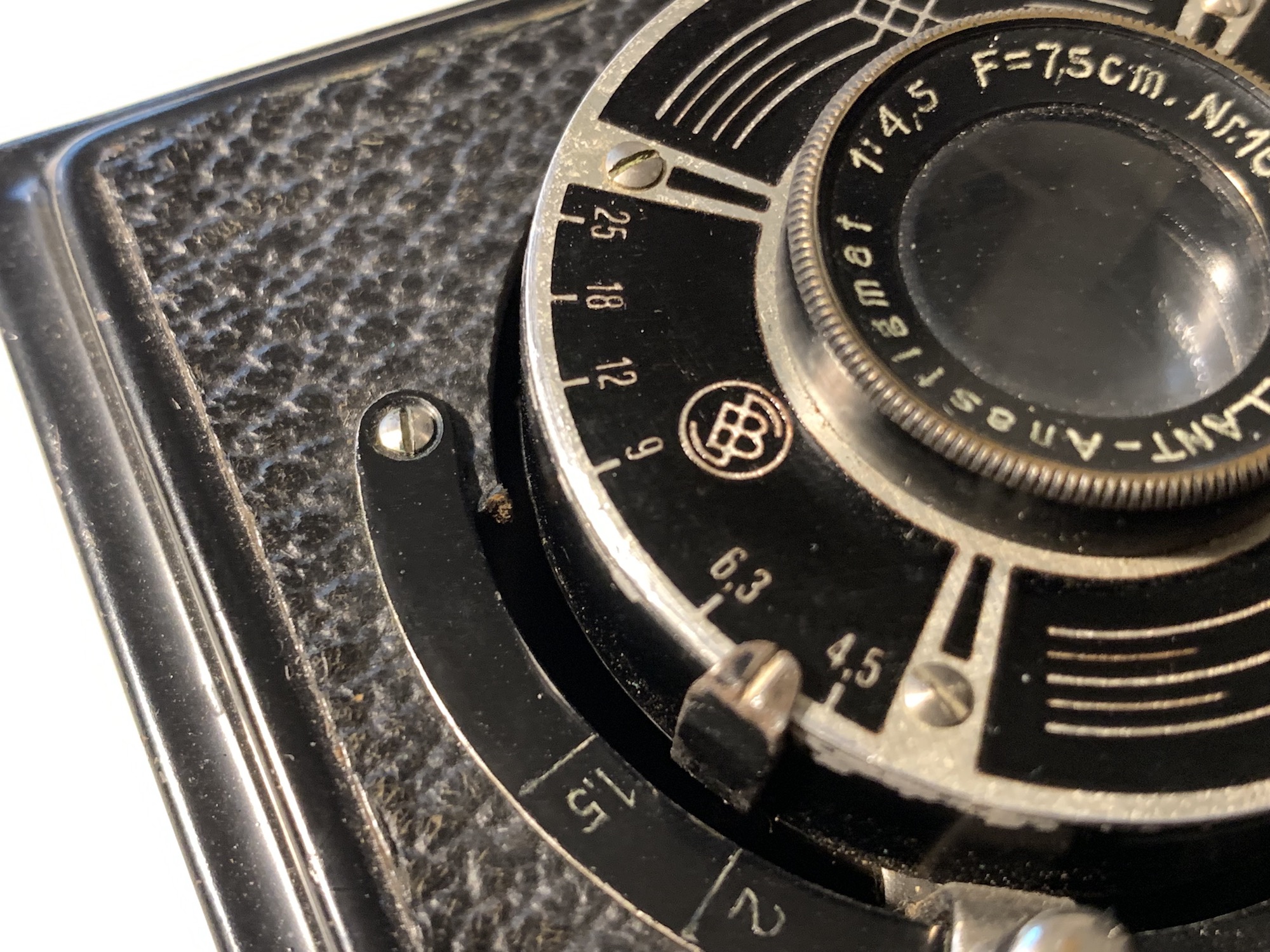 Ein zweites Exemplar zeigt eine Wölbung im Sucherdeckel, hier gibt es auch eine Sucherlupe, die mit dem seitlichen Hebel ausgeklappt wird, und eine Schärfetiefentabelle. Dieses Exemplar hat ein Rotfenster für die 6x6-Beschriftung und ist sogar mit einem Panschieber ausgestattet. Als Objektiv ist ein "Brillantar" 3,5/7,5 in Compur verbaut. Die Beschriftung für 6x6 muss Mitte der 30er Jahre aufgekommen sein. Ansonsten ist die Kamera weitgehend gleich, nur der Fokusgriff ist etwas kräftiger ausgeführt.