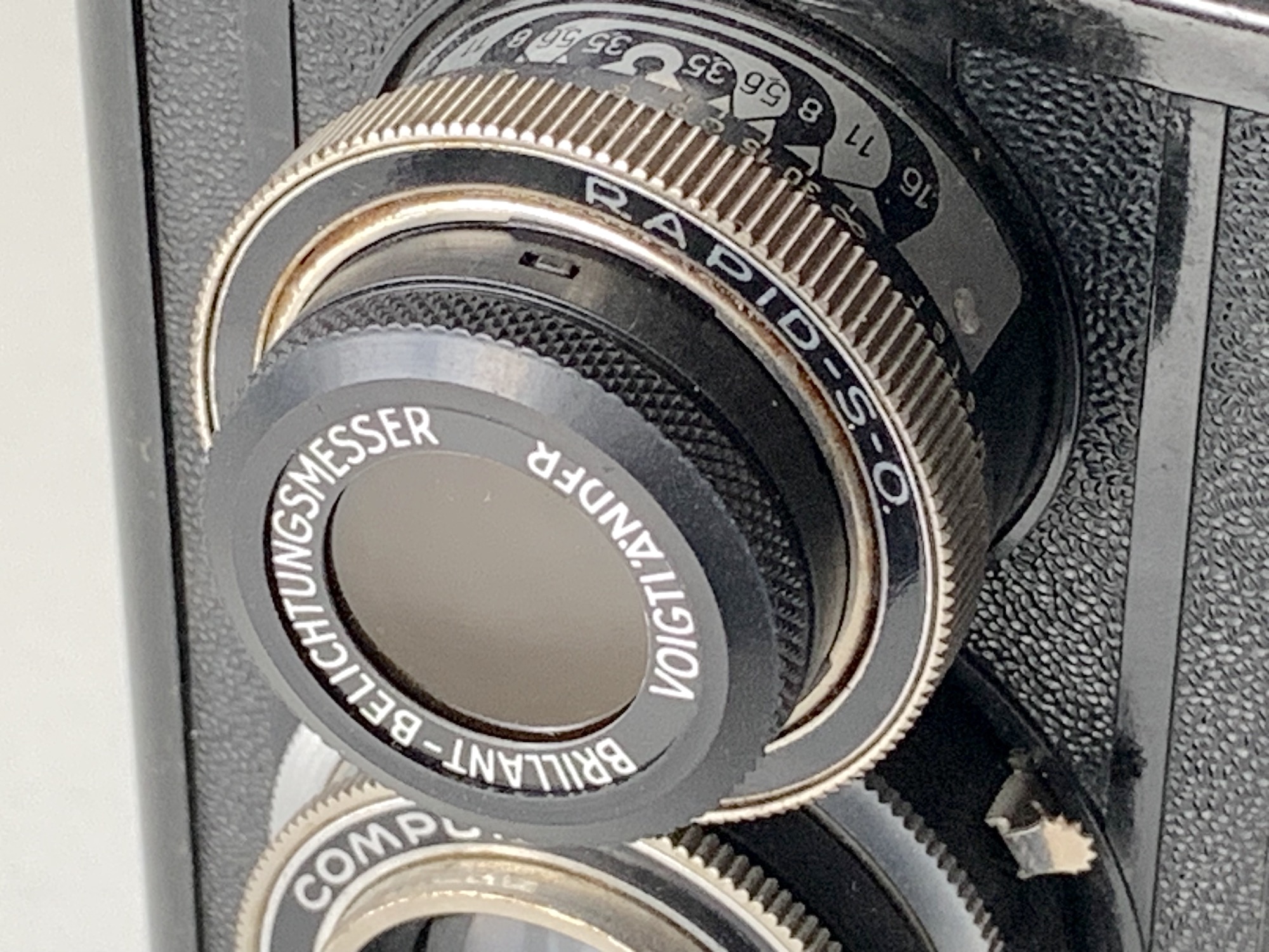 zu 1: Eine berechtigte Frage, die ich mir, ehrlich gesagt, noch nie gestellt habe, da es mir noch gar nicht aufgefallen ist... Nun habe ich gerade noch einmal die Kamera inspiziert und bei Prochnow nachgesehen: Es ist tatsächlich ein Compur-Rapid verbaut, und die Variante mit Heliar wurde auch nur mit diesem Verschluss angeboten. Für die Beschriftung Compur habe ich nur diese Erklärung: Der Verschluss ist ja überbaut, der Abdeckring mit Beschriftung geht also auf Voigtländer zurück, nicht auf Deckel. Möglicherweise hatte man in Braunschweig kein besonders großes Interesse an der genauen Beschriftung, vielleicht waren auch nicht genügend Teile auf Vorrat. Die Seriennummern des Heliars und des Verschlusses legen ein Baujahr 1939 oder später nahe; denkbar, dass in dieser Zeit verbaut wurde, was am Lager war. – Ich kann natürlich auch nicht ausschließen, dass bei einer Reparatur einmal etwas ausgetauscht wurde, habe aber keine Anhaltspunkte dafür; ich sehe keine Bastel- oder Reparaturspuren.