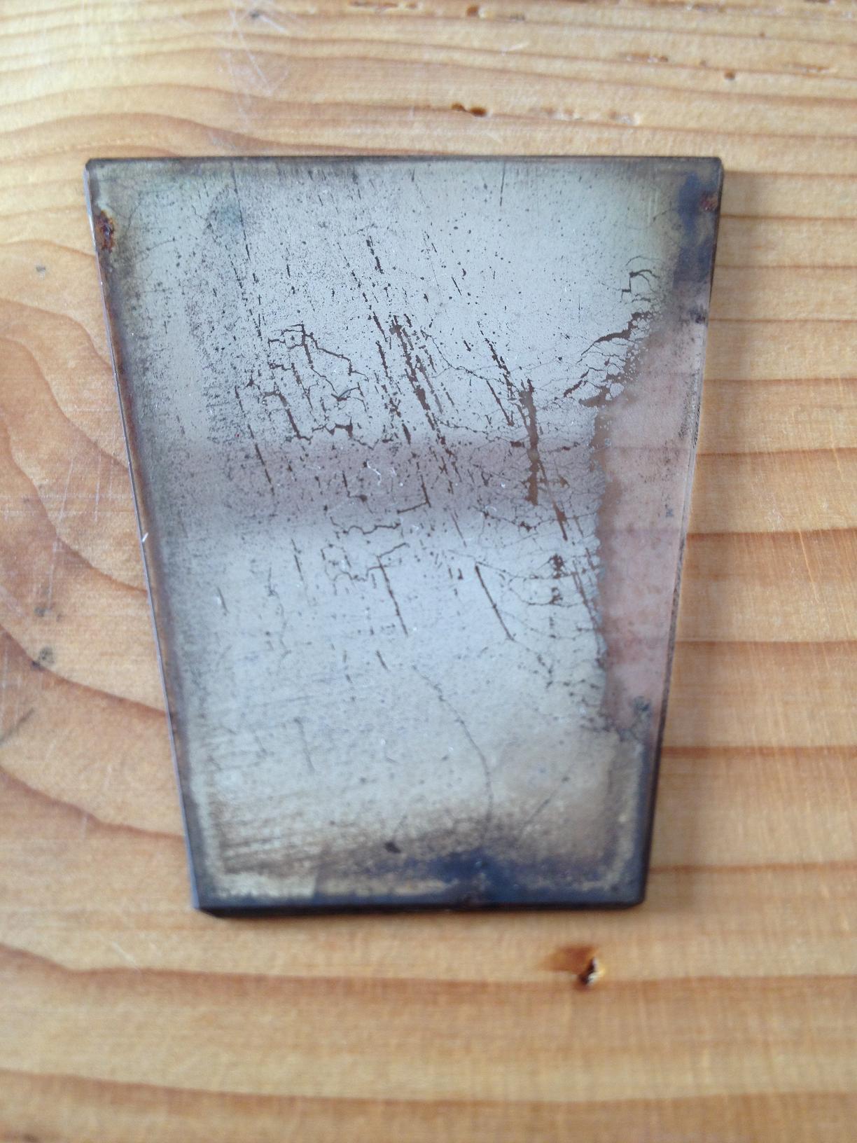 Ich hatte also einen Teller mit Aluminiumfolie ausgelegt und kochendes Salzwasser hineingeschüttet, sowie den blinden Spiegel draufgelegt, sodass er Kontakt mit dem Aluminium hatte. In ca. einer Sekunde war er klar. Bei der ersten Bewegung lösten sich aber die ersten Silberflocken, und als ich noch Leitungswasser drüber laufen ließ, kamen ca. vierzig Prozent der Silberoberfläche mit oder klappten sich um (die dunklen Flecken auf dem Bild, wo sich das Fenster nur schemenhaft spiegelt), bis ich merkte, wie empfindlich die Schicht ist.