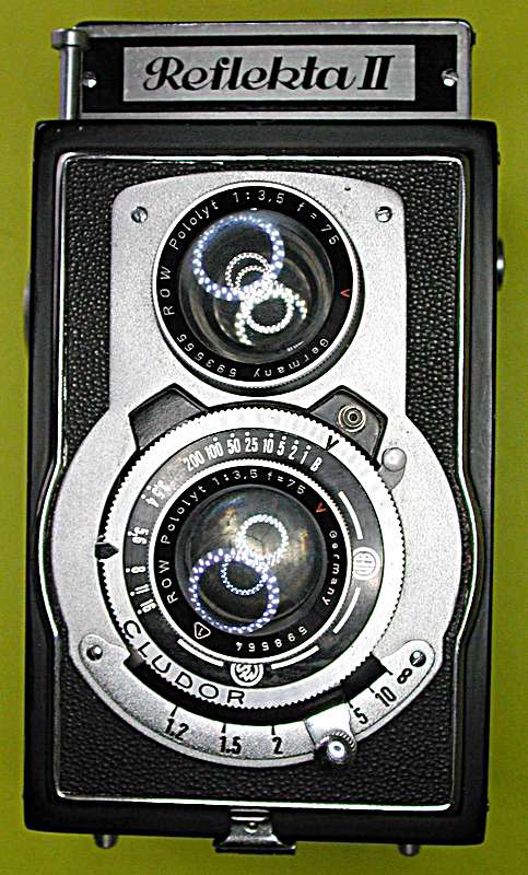 Ich habe bisher von einer Vorstellung meiner Reflekta II abgesehen, weil diese dann doppelt wäre. Aber ich sehe gerade, daß meine eine andere Ausstattung hat als die hier vorgestellte, namentlich eine Objektiv/Verschlußkombination "Pololyt 1:3.5 f-75mm V" und "Cludor 1-1/200stel Sekunde". Daher hänge ich hier ein Bild dieser Variante an: