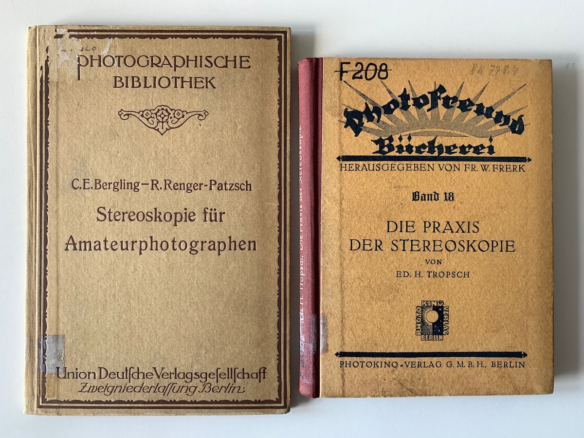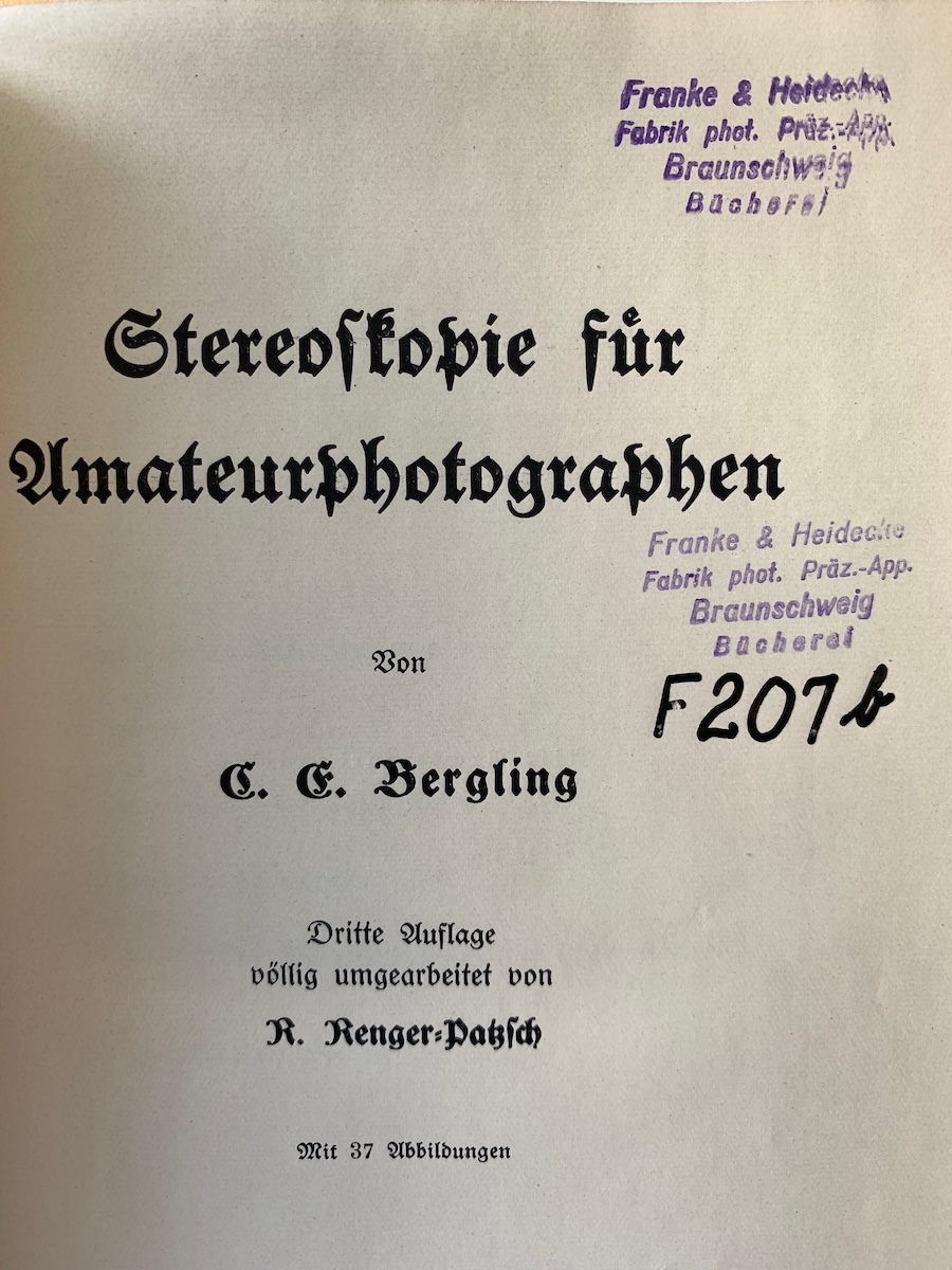 da ich gerade über dieses Thema gestolpert bin: F & H besaß natürlich auch eine Werksbibliothek. Die wurde seinerzeit über einen Antiquar aufgelöst, und zu meiner Freude stammen zwei Bände aus meiner 'Stereo-Bibliothek' von dort: 1919, also noch vor Gründung der Fa. Franke & Heidecke – Heidecke war noch bei Voigtländer beschäftigt –, erschien die von R. Renger-Patzsch besorgte 3. Auflage der Stereoskopie für Amateurphotographen von C. E. Bergling; dieses Buch war gemäß Eintrag in mindestens zwei Exemplaren vertreten. Vom Heidoscop war natürlich noch keine Rede. Außerdem das Standardwerk Die Praxis der Stereophotographie von Ed. Tropsch (1931), in dem die Produkte von F & H bereits ausgiebig erwähnt werden. Tropsch hat auf zwei Seiten Anstreichungen, aber keins der Bücher hat ausführliche Annotationen; es werden also nicht die Handexemplare Heideckes gewesen sein. Trotzdem finde ich die Provenienz beeindruckend...