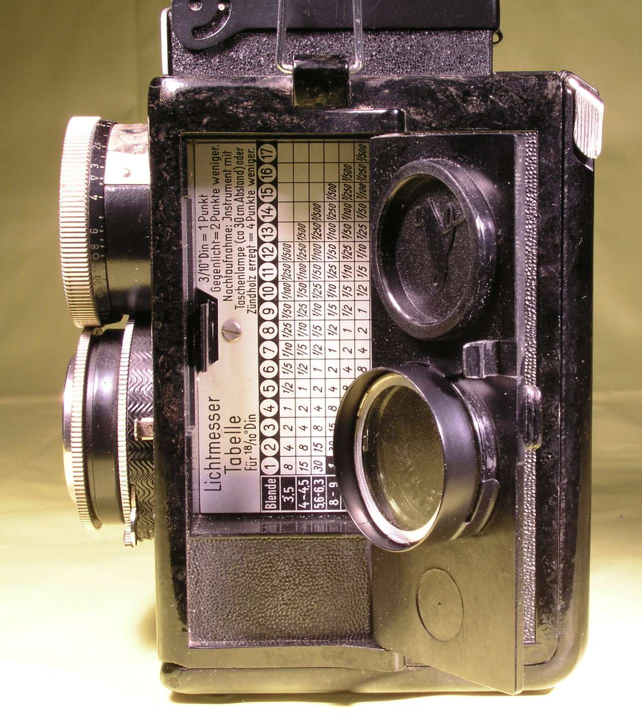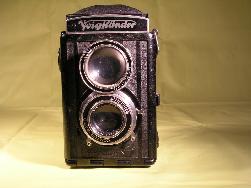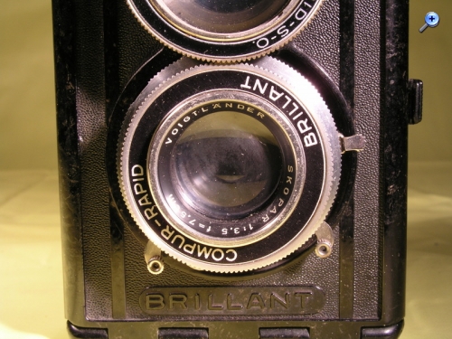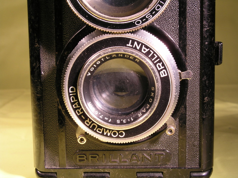 Hersteller, Modell: Voigtländer Brillant Baujahr: 1938 - 1950 Format: 6 x 6 cm Rollfilm. Objektiv: Voigtländer Anastigmat Skopar 1:3,5. F=7,5 cm. Aufnahmen: 12 Blenden: 3,5 - 22 Verschluss: Compur-Rapid. B, T, 1 Sek - 1/500 Sek Aufzug und Auslösung am Objektiv Blitz: nein (wurde m.W. gelegentlich durch Umbau in der Nachkriegszeit nachgerüstet) Belichtungsmesser: optischer Aufsteckbelichtungsmesser mit Tabelle in Zubehörfach Filmzählwerk: ja und auf Film, rückstellbar Sucher: Aufklappbarer Spiegelreflexsucher, Klarglaslinse mit Mattscheibenfleck Sportsucher: optischer Durchsichtssucher Filmtransport: Drehknauf Entfernungsmesser: über Mattscheibe Gehäuse: Bakelit mit Zubehörtür (seit 1937) Gewicht: ca. 550 Gramm Abmessungen geschlossen: ca. 94 x 117 x 85mm Besonderheiten, Sonstiges: Stativgewinde. Drahtauslöser, Zubehörfach z.B. für Gelbfilter