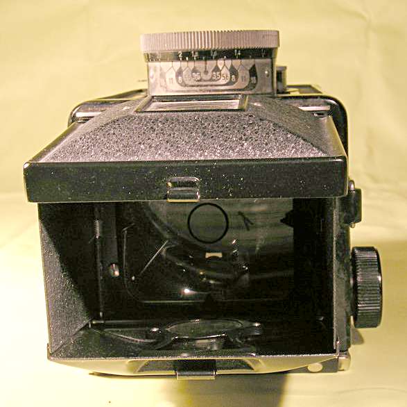 Fokussiert wurde auf dem Mattscheibenfleck in der brillanten, auch bei wenig Licht gut sichtbaren (wenn man geradeaus reinguckte ...) Sucherlinse. Die Sucherlupe zum präzisesten Einstellen kann herausgeklappt werden: