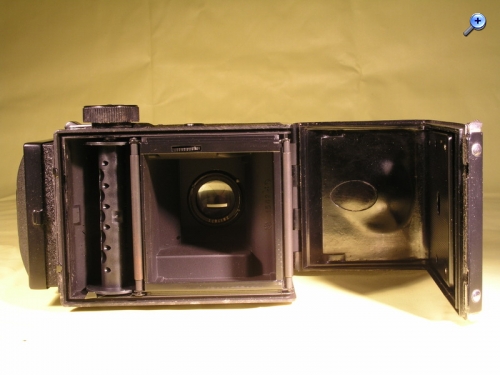 Die Kamera mit unverlierbarer Rückwand. Man erkennt das Rad für den nicht immer zuverlässigen Bildzähler:
