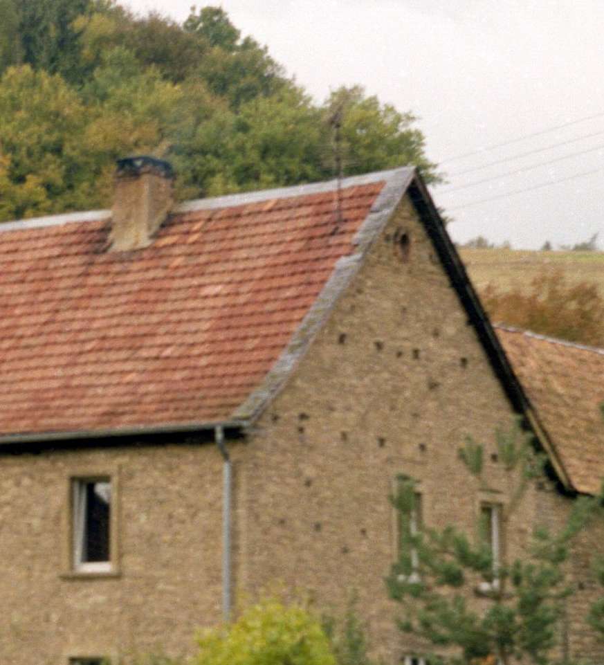 Voigtländer Brillant mit Color-Skopar und Compur-Rapid. Dieses spezielle Exemplar aus der Vorkriegszeit war bei meinem Vater seit Ende der 40er Jahre in Gebrauch und lieferte inzwischen flaue Bilder, sodass ich nachstehend nur ein stark nachbearbeitetes mit entsprechendem Bildrauschen, weit übertriebener Vignettierung usw. für eine Beurteilung der Bildschärfe zeigen kann.