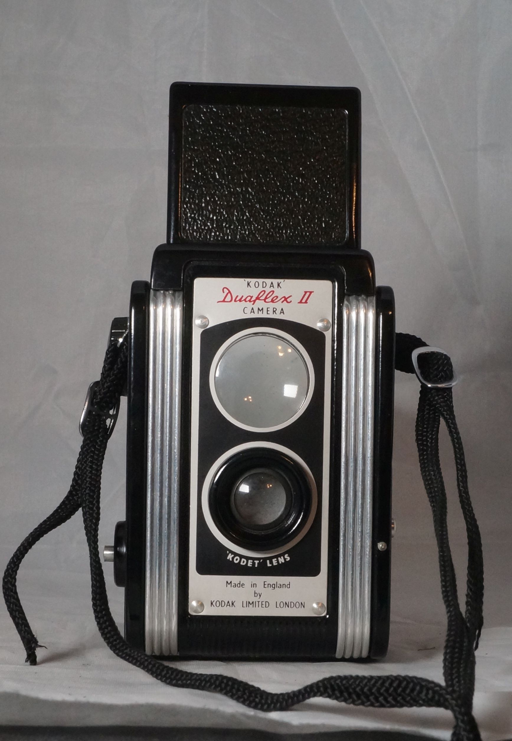 Hersteller, Modell: Kodak Duaflex II Baujahr: 1950 bis 1954 Herkunft: England Filmtyp: 120 / 620 Film Format: 6x6 cm Kameratyp: Doppeläugige Boxkamera Sucher: Klapp-Schachtsucher Objektiv: Kodet Lens, 75 mm, 1:15 Verschluß: B und ca. 1/40 tel.