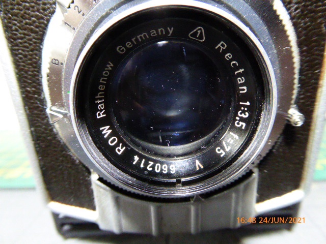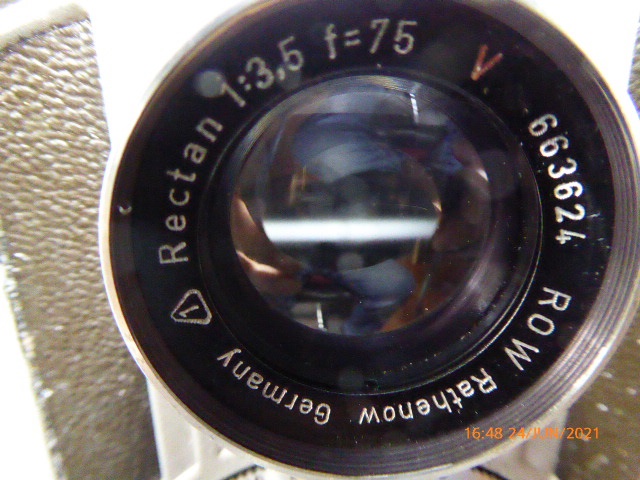 Objektive (Aufnahme/Sucher): Meyer Görlitz Trioplan 7,5 cm f/3.5 F bzw. ROW Rathenow Rectan 7,5 cm f/3.5 F