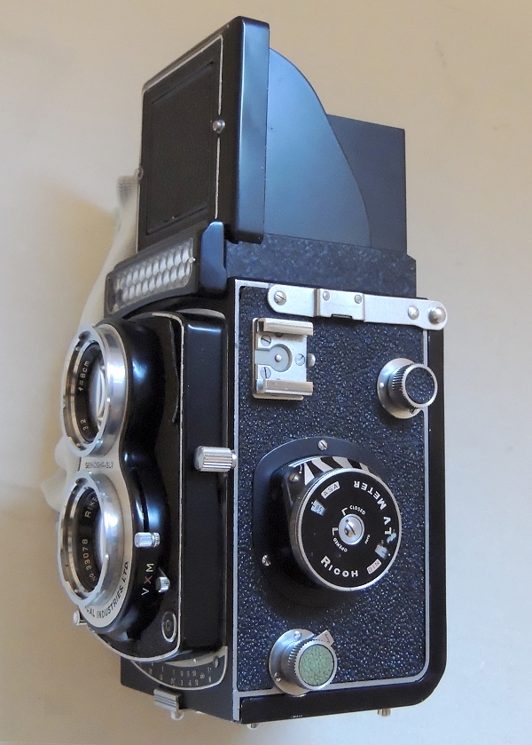 Die gezeigte Modellvariante hat keine schwenkbare Doppelschlitz-Abdeckung für den Belichtungsmesser. Es ist somit noch nicht klar, ob hier nicht nur die Abdeckung (die ja auch eine Funktion hatte) verloren gegangen ist. Ich habe jedenfalls im WWW weitere Ricohmatic 225 Modelle gefunden, die keine Abdeckung haben. Wie wird dabei die zu hohe Anzeige des Belichtungsmessers bei Tageslicht kompensiert?