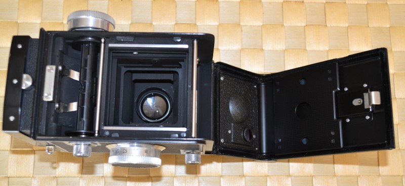 Anbei ein Foto der geöffneten Ikoflex. Auf den ersten Blick nichts besonders aufregendes, aber die grundsolide Konstruktion und das exakte Zusammenfinden von Deckel und Gehäuse in Verbindung mit der kräftigen Andruckplatte wird im Vergleich zur Konkurrenz schon einen Unterschied gemacht haben.