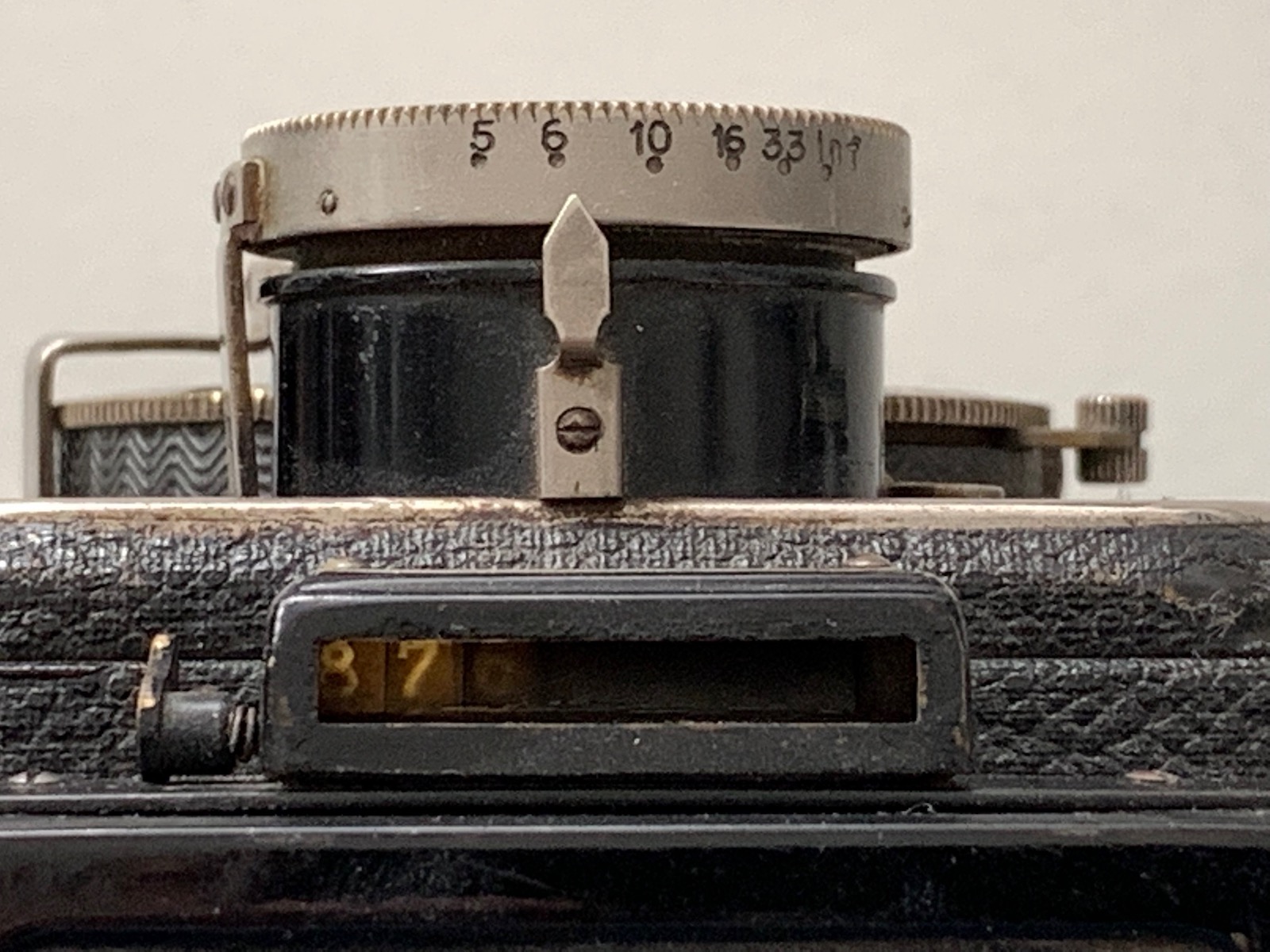 So gibt es die Kamera mit Auslösesperre, die Doppelbelichtungen verhindern sollte: Nach der Belichtung wurde der Auslöser mechanisch gesperrt, eine Entsperrung erfolgt erst, wenn der Rotfensterverschluss auf der Rückseite wieder geschlossen wurde. Die Mechanik ist in dem Kasten auf der rechten Seite untergebracht.