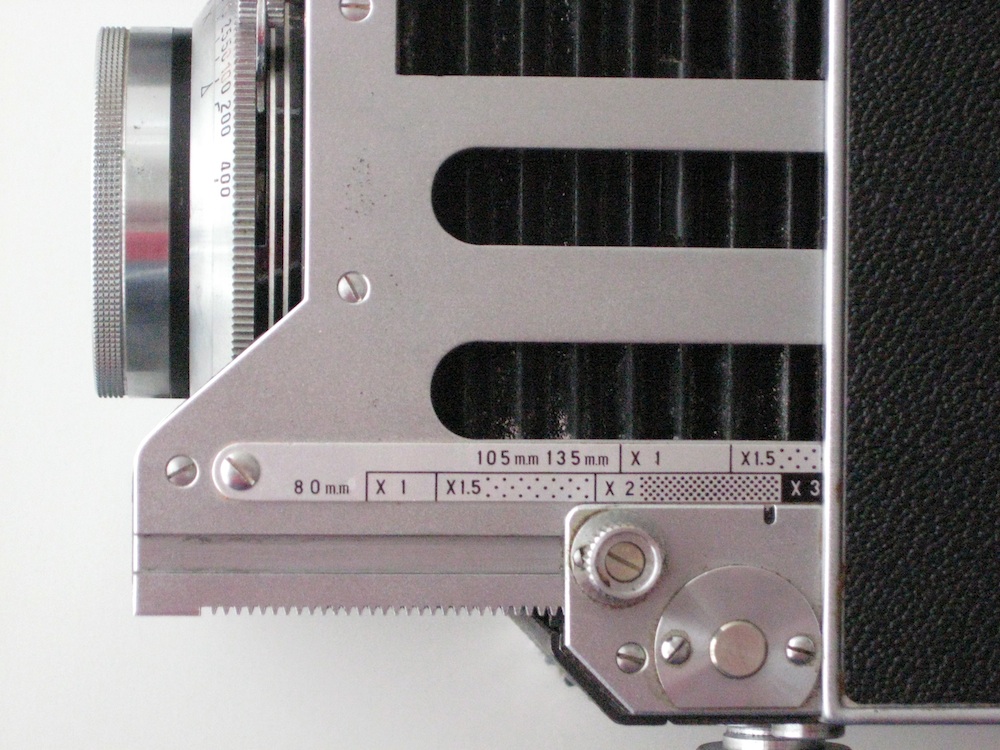 Auf den ersten Blick wirkt sie asymmetrisch: Fehlt da etwas? Nein, diese Kamera hat nur einen Fokusknopf auf der rechten Seite; auf der anderen Seite befindet sich ein Feststeller. Auf der linken Seite sieht man, wie bei späteren C-Modellen auch, die Skalen für Belichtungsverlängerung bei längeren Auszügen. Im Prinzip lassen sich alle Wechselobjektive der C-Serie verwenden, auch die neuesten. Der Verschluss muss manuell gespannt werden. Angesetzt ist hier ein Sekor 2,8/8 cm mit Seikosha MX-Verschluss, auf dem anderen Bild das 3,5/105 DS. Der Drahtbügel, mit dem die Objektive gehalten werden, ist übrigens rechts angeschlagen (bei späteren Modellen links).