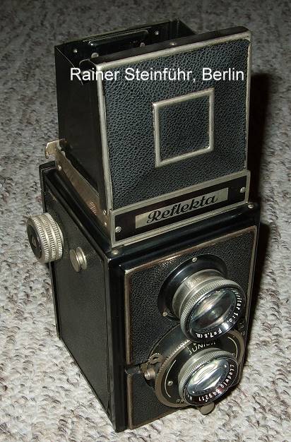 Sucher: Ausklappbarer Winkel-Spiegelreflexsucher mit Betrachtungsschacht und einschwenkbarer Lupe, seitenverkehrt. Meritar 1:1,5 f=7,5 cm. Sucherobjektiv ist mit der Entfernungseinstellung gekoppelt. Somit eine "echte" zweiäugige Spiegelreflexkamera!