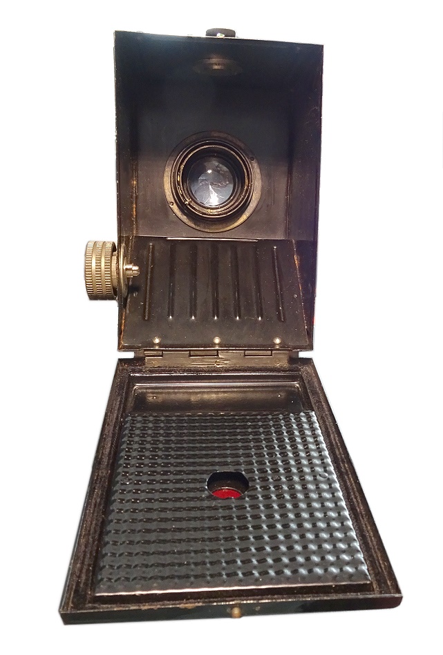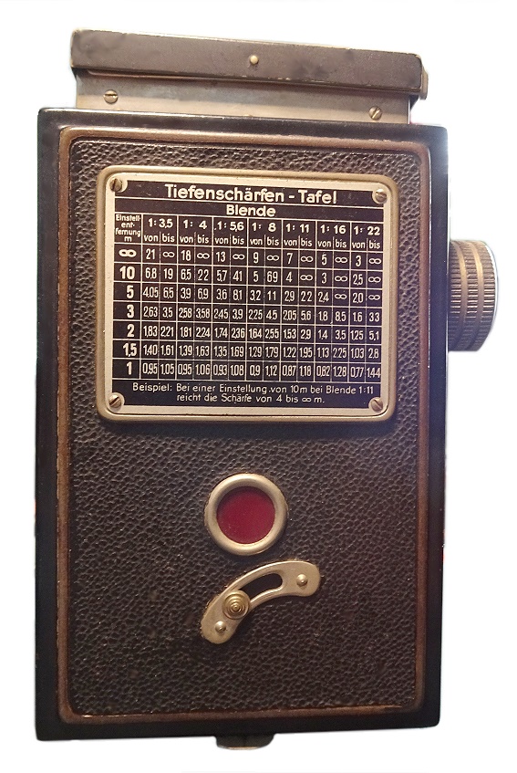 Objektiv: Meritar 1:3,5 f=7,5cm. Extra Schärfentiefetabelle auf Rückwand