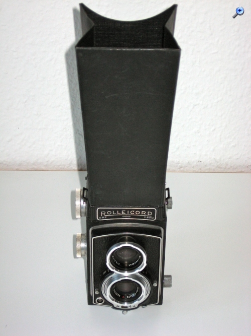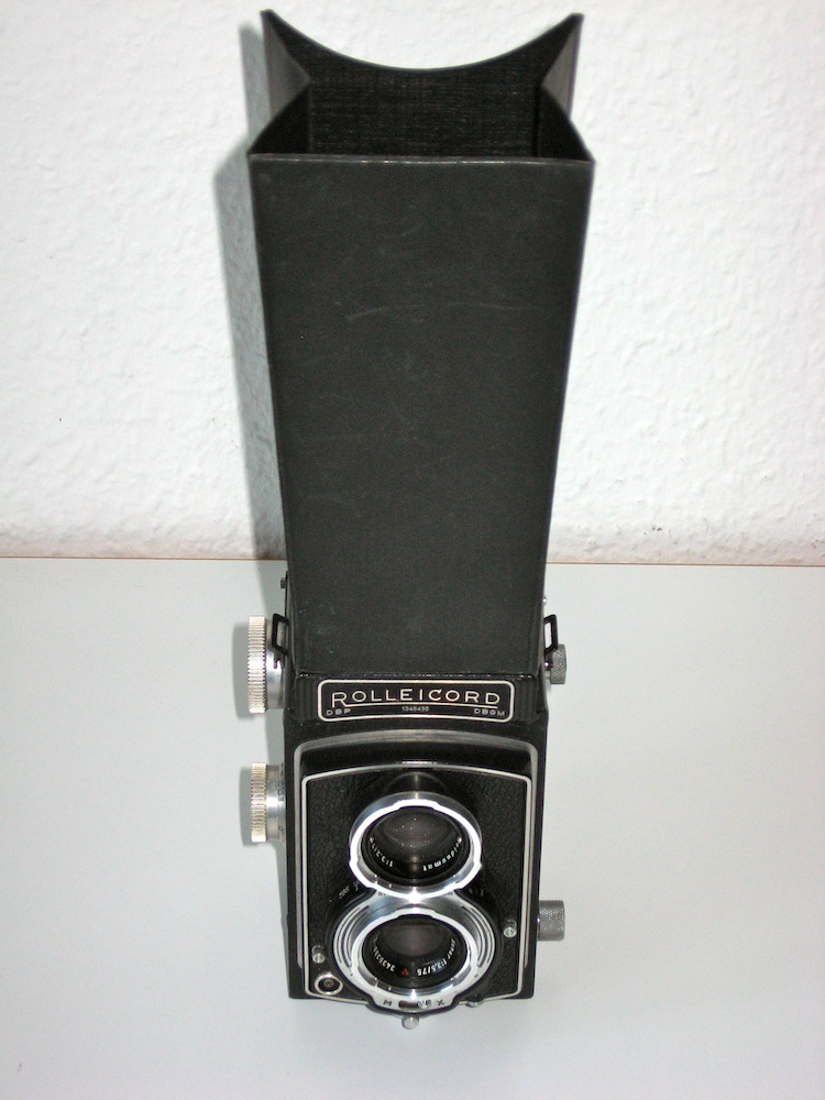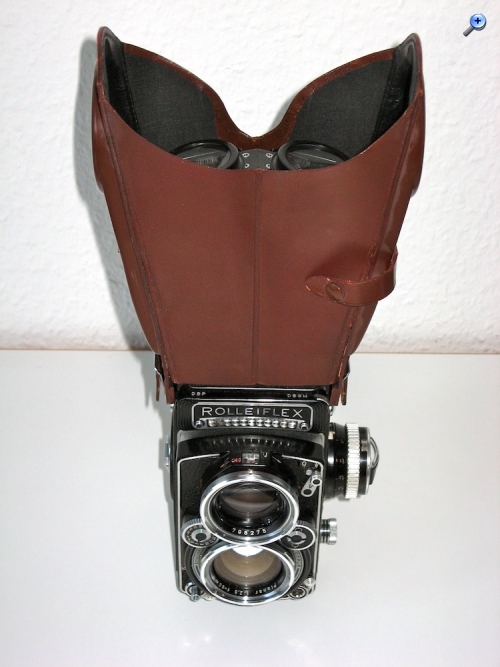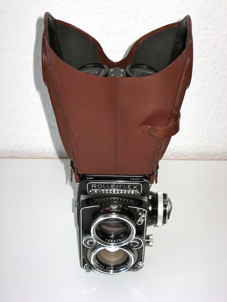 hier ein nicht so häufig zu sehendes Zubehörteil zur Rolleiflex, ein binokularer Leder-Lichtschacht zum Aufstecken auf den Lichtschachtsucher. Die Öffnung ist der Gesichtsform angepasst, oben befinden sich zwei Lupen mit zweifacher Vergrößerung, deren Abstand zueinander justiert werden kann. Dieser Aufsteckschacht ermöglicht die bequeme Kontrolle des gesamten Mattscheibenbildes unter Ausschaltung von Fremdlicht. Bei Nichtgebrauch kann der Schacht flach zusammengeklappt werden, er nimmt nur wenig Platz ein. Angeboten wurde dieses raffinierte Zubehörteil im Zeitraum 1958–1966, es kostete 1958 48,00 DM (Angaben aus Prochnow, Rollei-Report 2, Nr. PR 287).