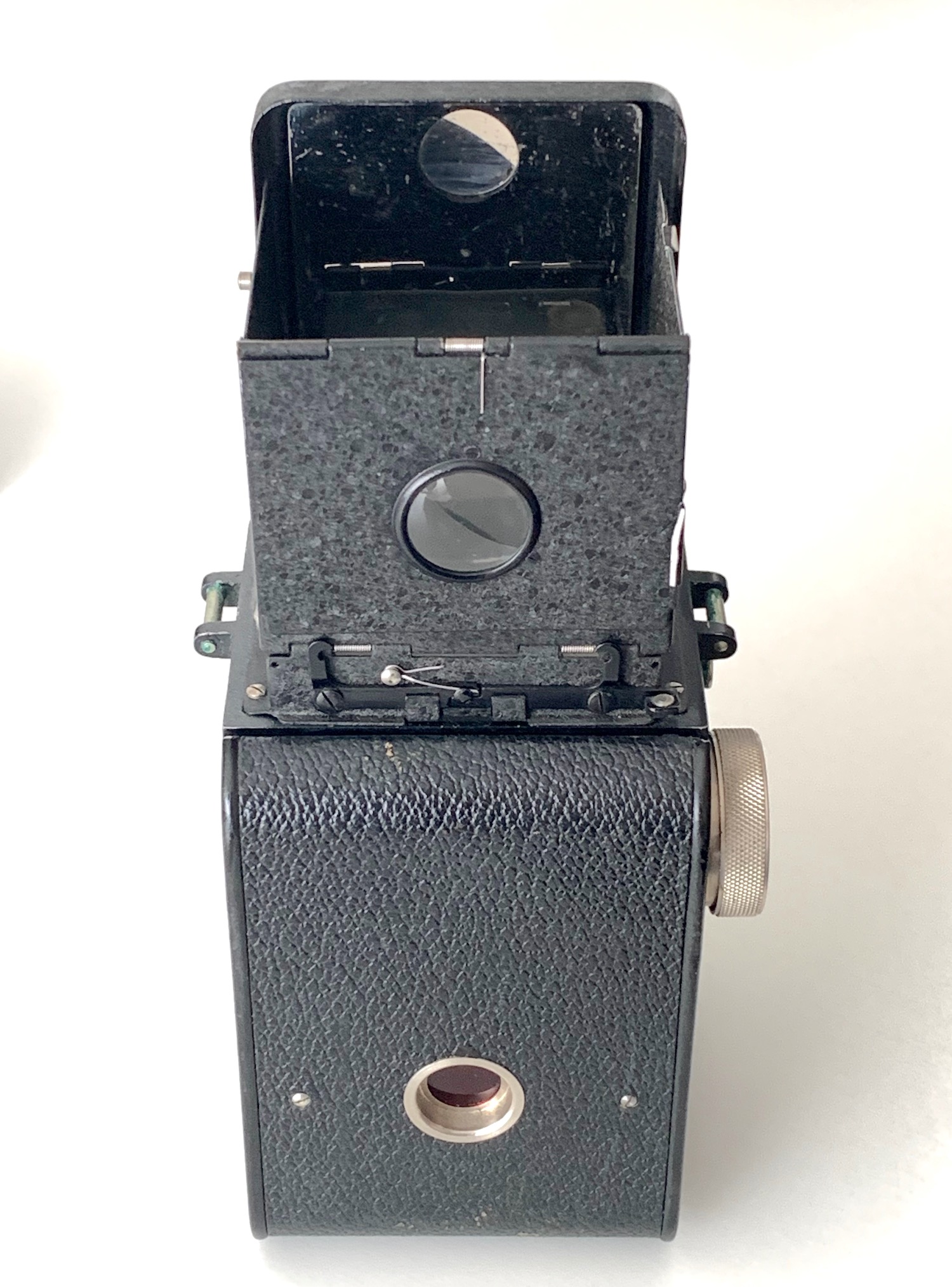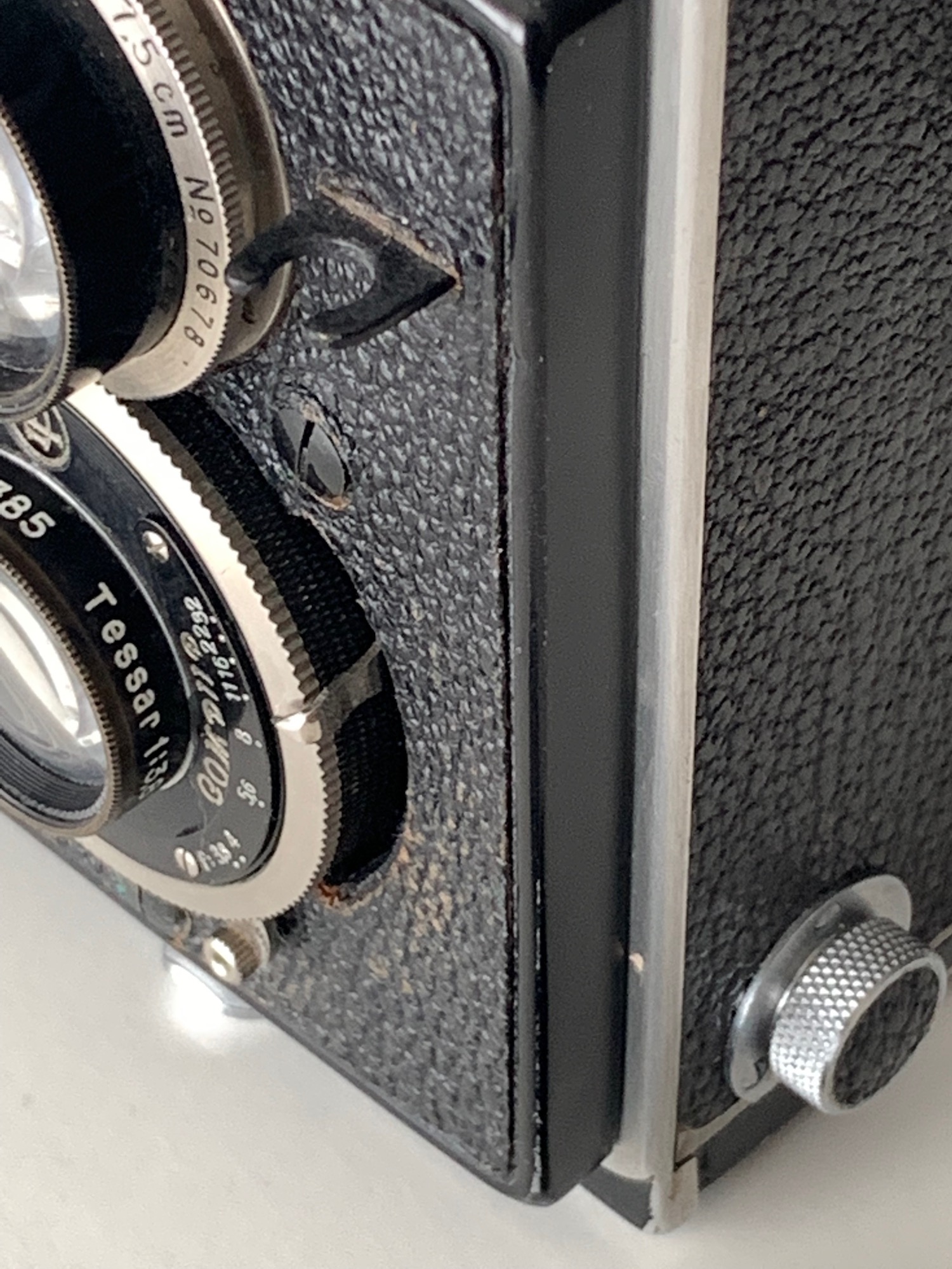 In der Tat wurde dieser Spulenknopf nachgerüstet, und zwar zur Verwendung von 620er (!) Film. Die Rolleiflex war ursprünglich für den Film B I-6 bestimmt, mit dem 6 Aufnahmen gemacht werden konnten. Die größeren Spulen passten zunächst nicht in die Filmkammern; das galt erst recht für die 120er Filme. Ich habe aber schon Exemplare gesehen, bei denen die Rückwand eine Fräsung erhalten hat, sodass 120er Spulen eingesetzt werden konnten. Bei den oben gezeigten Exemplaren ist das leider nicht möglich.