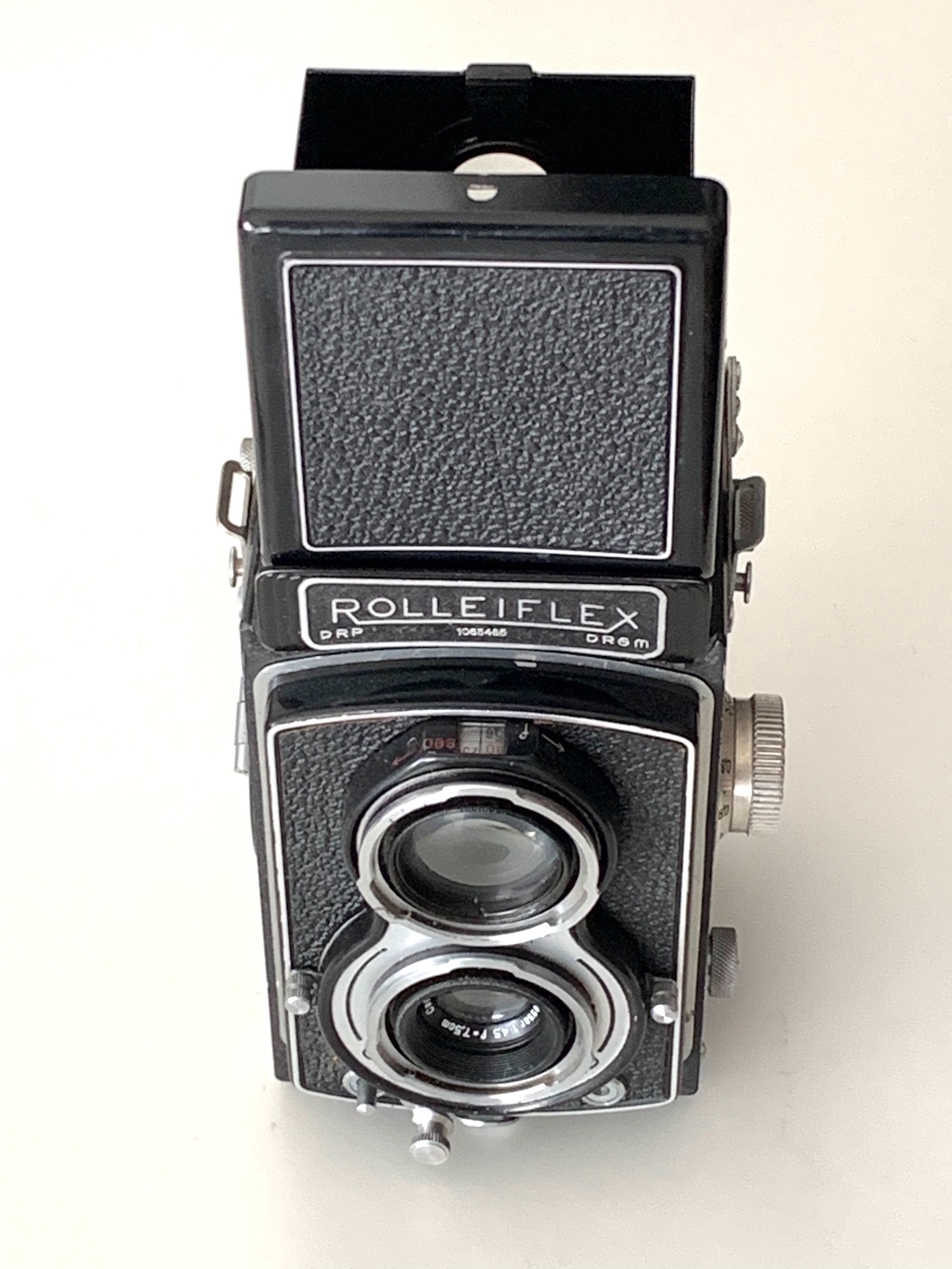 Oben habe ich geschrieben, dass normalerweise ein Tessar 3,5 verbaut war. Das hier vorgestelle Exemplar besitzt aber ein Tessar 4,5/7,5, das gemäß Seriennummer im Jahr 1930 hergestellt wurde. Tessare mit Lichtstärke 4,5 gab es nur im ersten Modell der Rolleiflex. Als ich die Kamera vor ein paar Jahren kaufte, dachte ich zunächst, dass das Objektiv vielleicht im Rahmen einer Reparatur ausgetauscht wurde. Nun habe ich in den letzten Jahren bei ebay aber zwei weitere Exemplare mit Tessar 4,5 gesehen. Außerdem passt die siebenstellige Seriennummer der Kamera nicht in den bei Prochnow angegebenen Nummernkreis. Es drängt sich eine andere Erklärung auf: Dieses und die anderen Exemplare könnten aus früher Nachkriegsproduktion stammen, wobei Restbestände verwertet wurden. Prochnow bemerkt in Band 2, S. 16–343: "Nach dem Kriegsende erfolgte die Wiederaufnahme der Fertigung […] unter schwierigen Bedingungen. Die Möglichkeiten zum regulären Bezug von Werkstoffen und Zubehörteilen bestanden so gut wie gar nicht. Was sich noch an Teilen und Materialien im eigenen Lager befand, wurde verarbeitet."