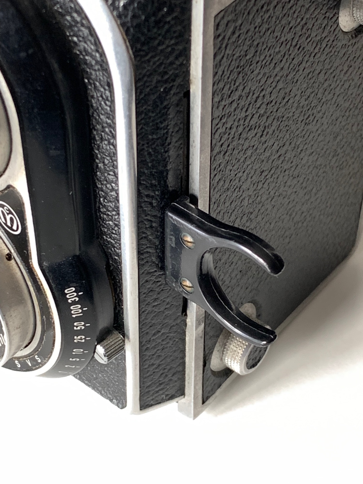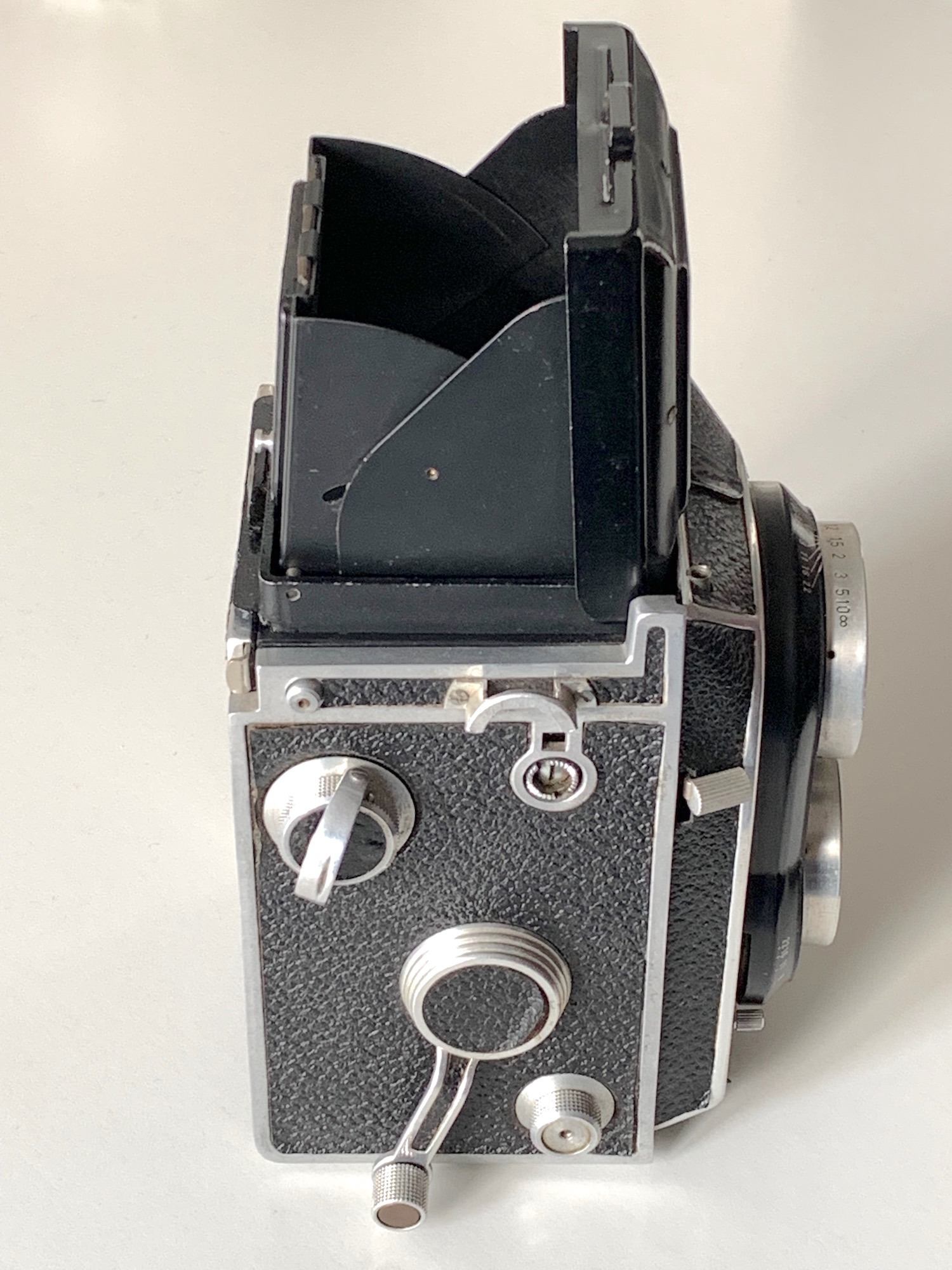 Die seitlich befindliche Kurbel zeigt, dass man es mit einer 'richtigen' Kamera zu tun hat; die meisten TLRs hatten einen Knopf für den Filmtransport. Die Kurbel muss anders als bei der Rolleiflex gegen den Uhrzeigersinn gedreht werden; mit einem Kurbelschwung werden das Zählwerk weitergeschaltet und der Verschluss gespannt.