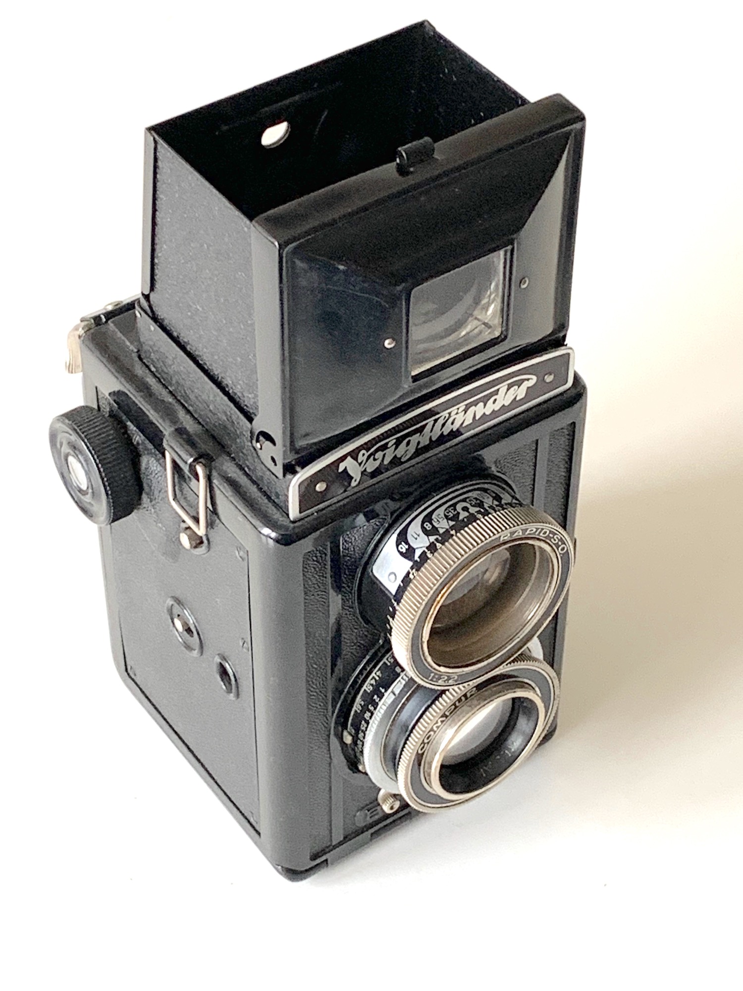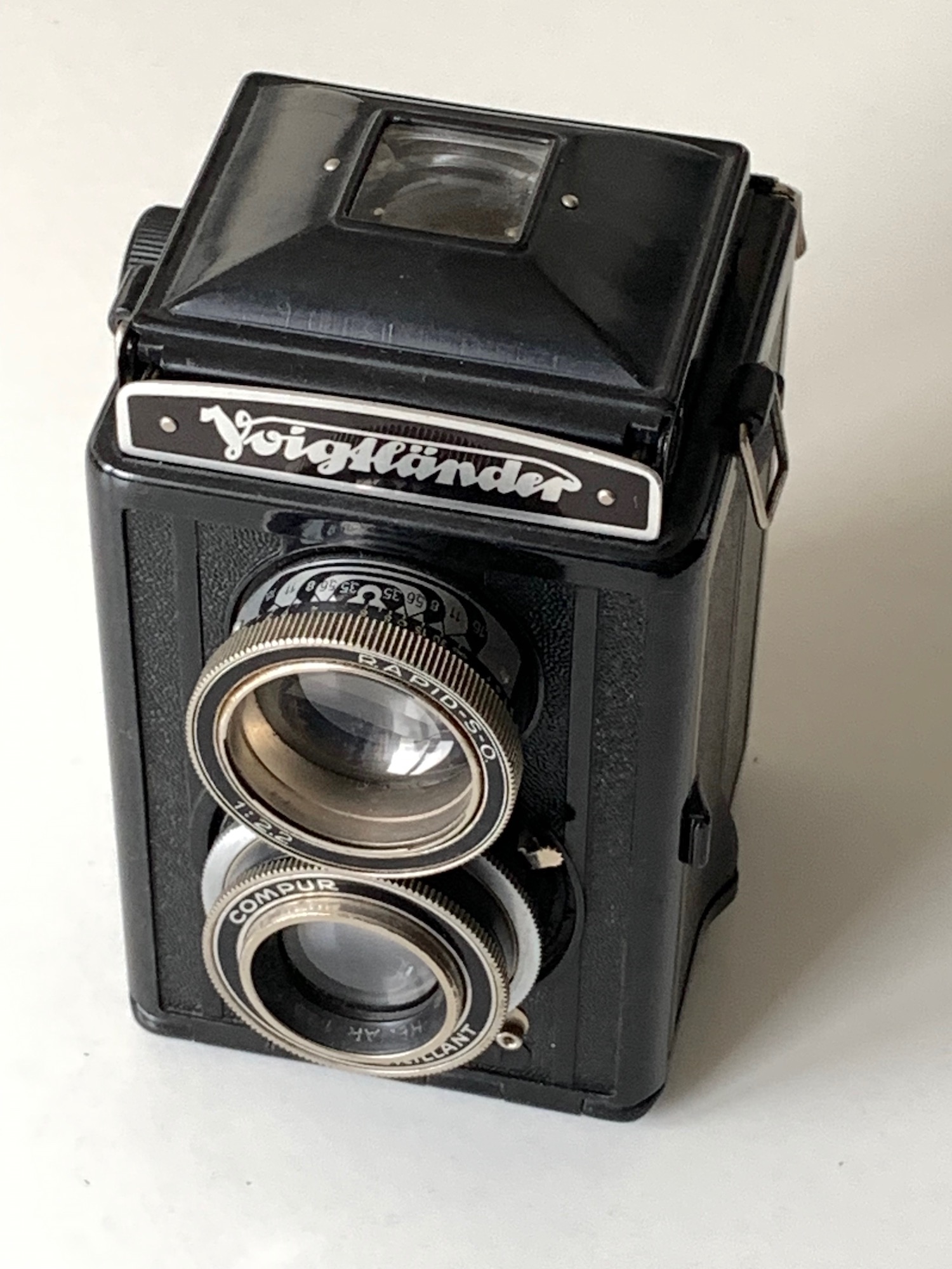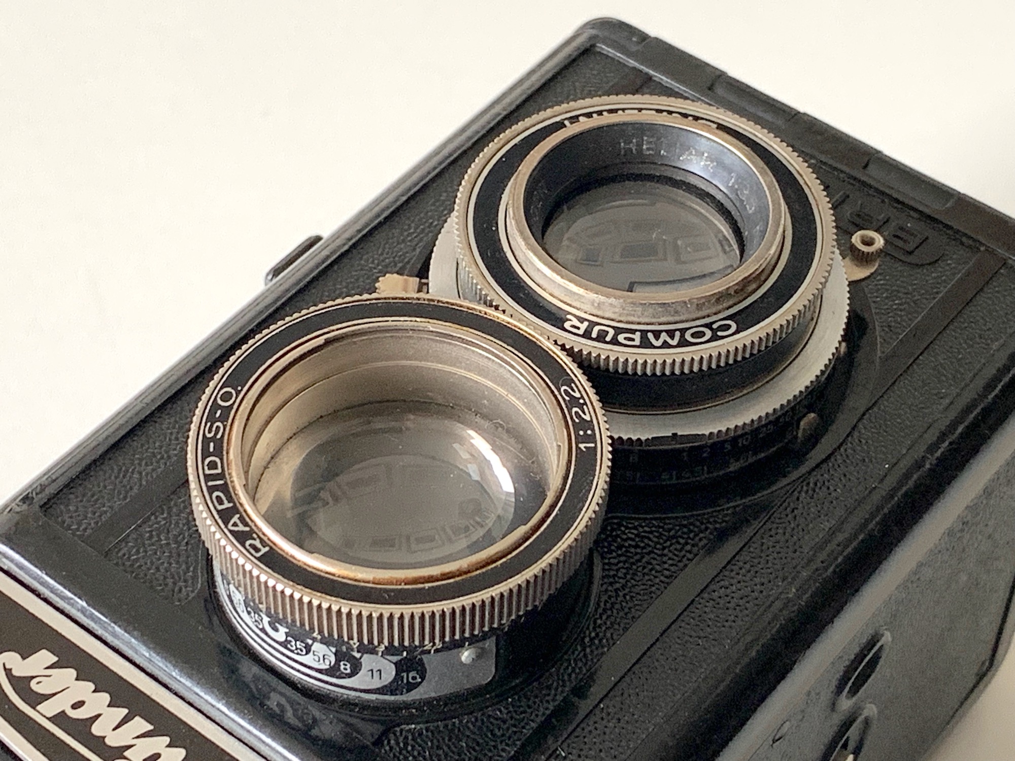 zu 1: Eine berechtigte Frage, die ich mir, ehrlich gesagt, noch nie gestellt habe, da es mir noch gar nicht aufgefallen ist... Nun habe ich gerade noch einmal die Kamera inspiziert und bei Prochnow nachgesehen: Es ist tatsächlich ein Compur-Rapid verbaut, und die Variante mit Heliar wurde auch nur mit diesem Verschluss angeboten. Für die Beschriftung Compur habe ich nur diese Erklärung: Der Verschluss ist ja überbaut, der Abdeckring mit Beschriftung geht also auf Voigtländer zurück, nicht auf Deckel. Möglicherweise hatte man in Braunschweig kein besonders großes Interesse an der genauen Beschriftung, vielleicht waren auch nicht genügend Teile auf Vorrat. Die Seriennummern des Heliars und des Verschlusses legen ein Baujahr 1939 oder später nahe; denkbar, dass in dieser Zeit verbaut wurde, was am Lager war. – Ich kann natürlich auch nicht ausschließen, dass bei einer Reparatur einmal etwas ausgetauscht wurde, habe aber keine Anhaltspunkte dafür; ich sehe keine Bastel- oder Reparaturspuren.