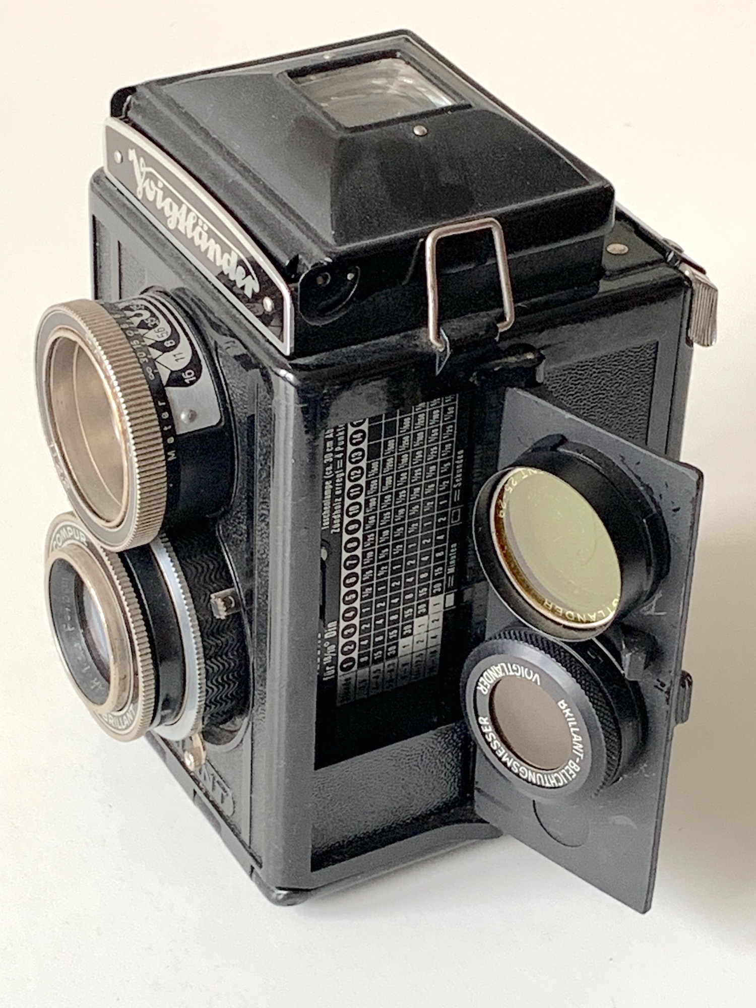 Der angesprochene Brillant-Belichtungsmesser wird zunächst dem Licht ausgesetzt und dann mittels Bajonett auf das Sucherobjektiv aufgesetzt. Man sieht je nach Helligkeit verschiedene leuchtende Punkte, denen jeweils eine Ziffer zugeordnet ist. Die zugehörigen Belichtungswerte sind in der Tabelle im 'Geheimfach' ablesbar. Maßgeblich ist der gerade noch wahrnehmbare Punkt. Die Funktionsweise ist auf den Seiten von Horst Neuhaus ausführlich beschrieben: https://photobutmore.de/vintagephoto/bel...dex.php#gruppe2