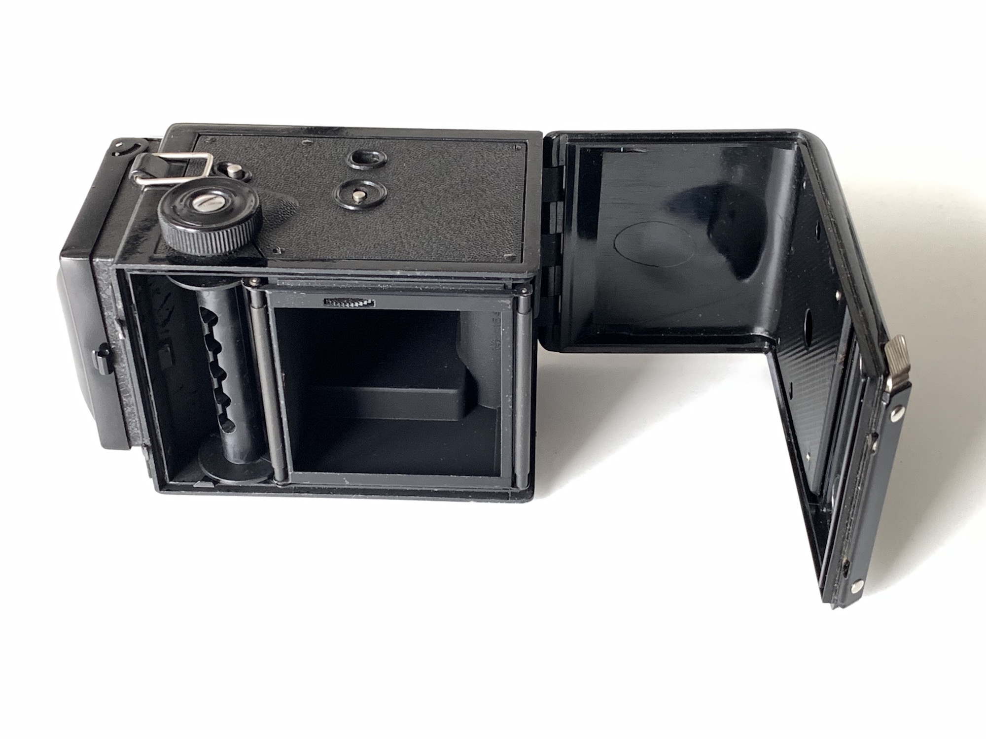 Ich habe schon länger eine Brillant S mit Voigtar 4,5/7,5 cm, die auch tadellos funktioniert. Nun ist kürzlich sehr preiswert eine mit Heliar 3,5 angekommen und diese bedarf umfangreicherer Wartung und Reinigung. Der Verschluss funktioniert nur bei den ganz schnellen Zeiten, der Spiegel ist unbrauchbar und das Zählwerk funktioniert auch nicht korrekt. Ich werde mich mal langsam voran tasten. Hier die ersten Impressionen: