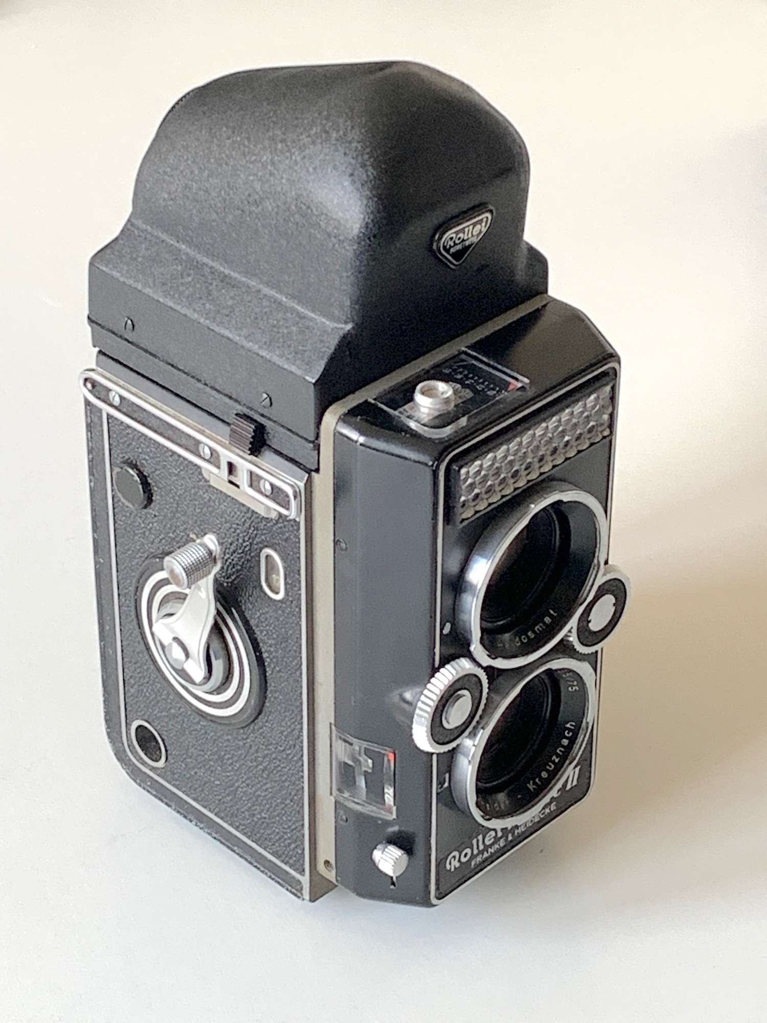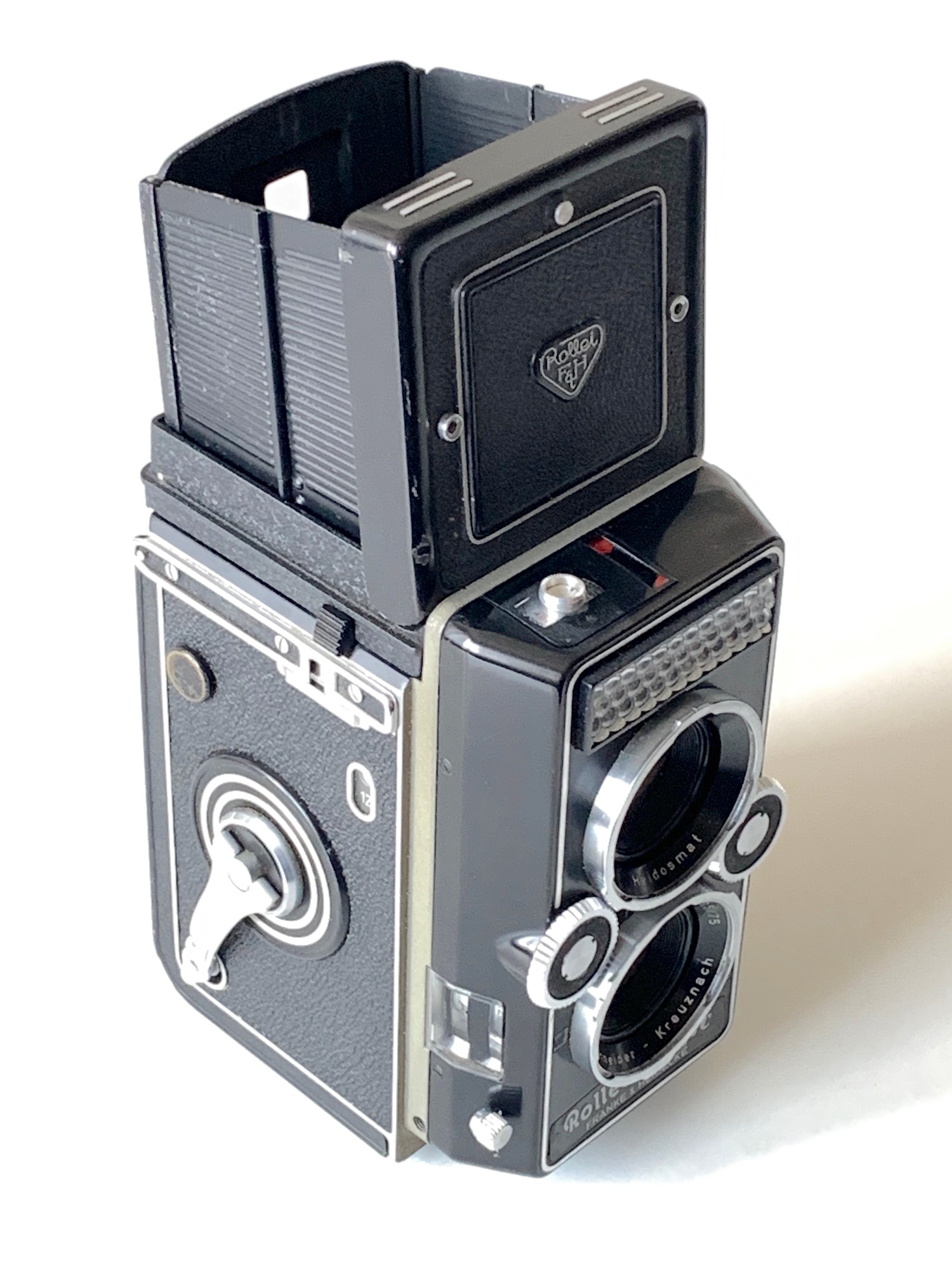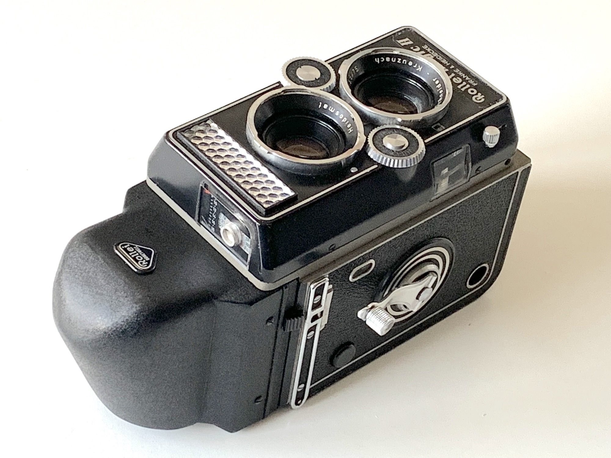 Man erkennt die von anderen Rolleiflex-Modellen bekannten Stellräder zwischen den Objektiven. Mit dem von oben gesehen linken Rad wird die Entfernung eingestellt, mit dem rechten Rad können die manuellen Funktionen "Blitzbetrieb" bzw. "B" aktiviert werden, das Rad dient dann zur Einstellung der Blende.