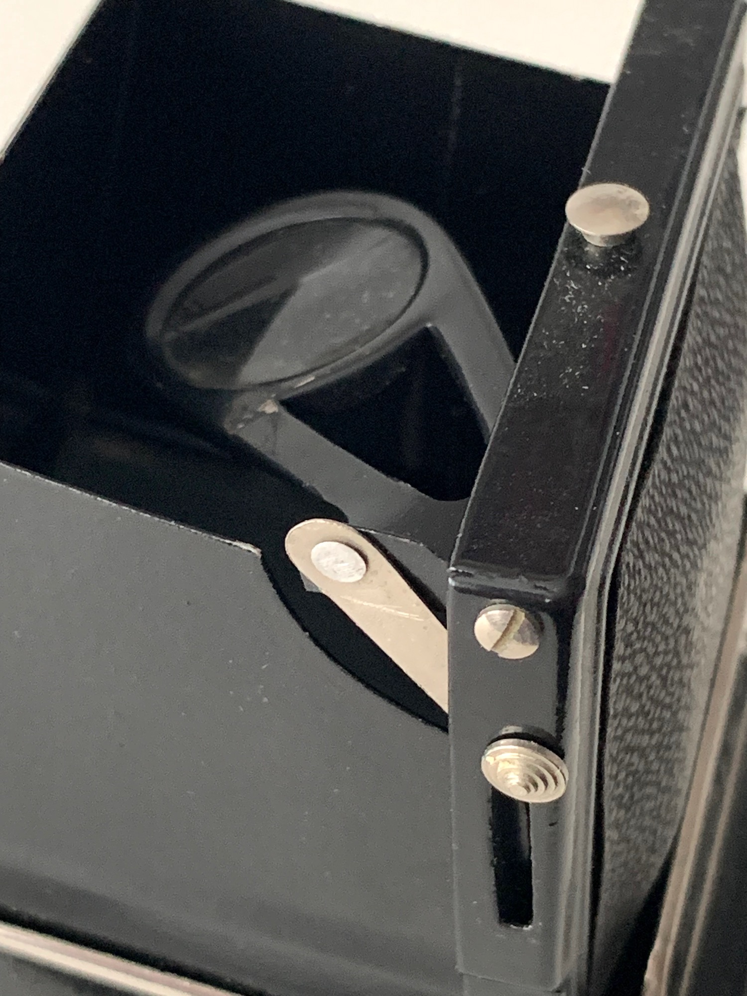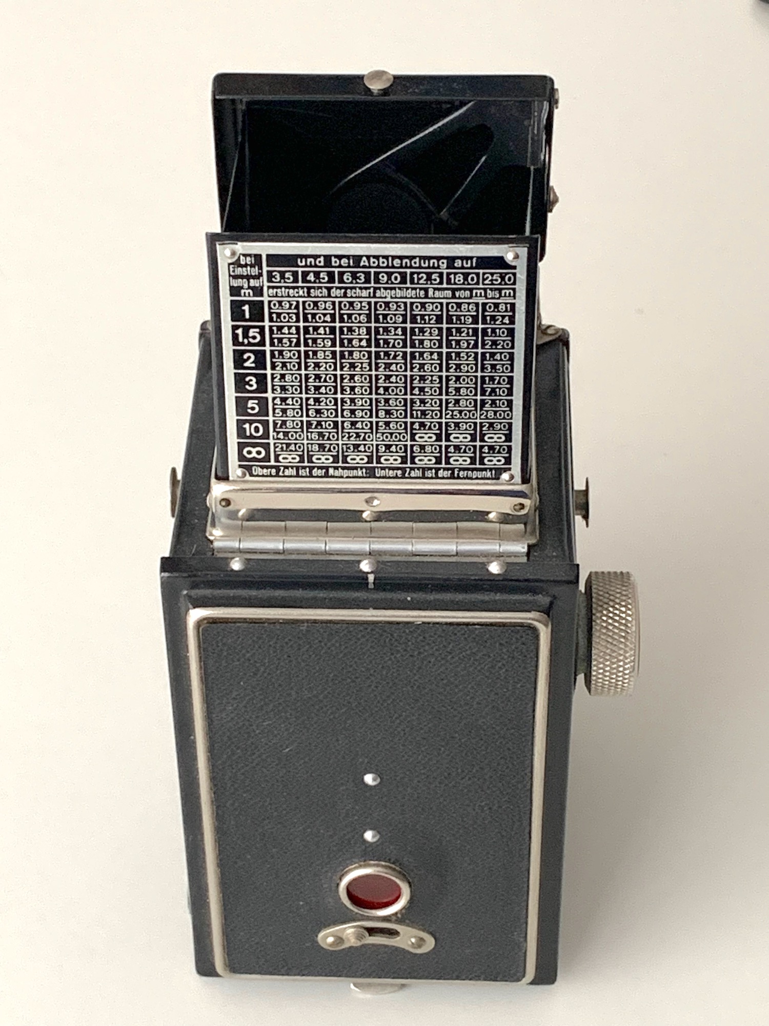 Der Film wird über einen Drehknopf unter Rotfensterbeobachtung transportiert; es gibt kein Zählwerk und keine Transportsperre. Die Kamera verfügt über einen Klappenlichtschacht mit ausschwenkbarer Lupe; dazu besitzt dieses erste Modell einen seitlichen Hebel.