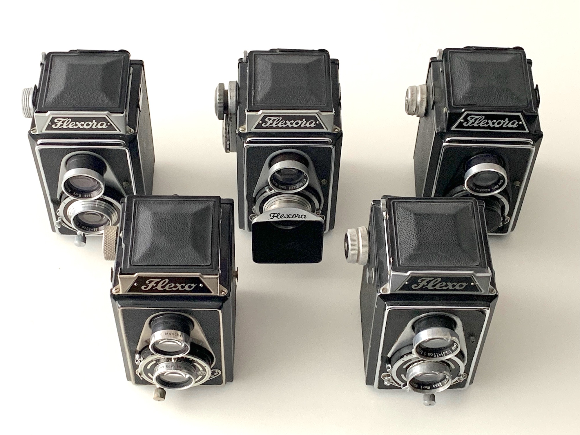Die verschiedenen Flexo- und Flexora-Modelle, für die Peter Barz eine Typologie entworfen hat, unterscheiden sich einerseits hinsichtlich der Objektiv- und Verschlussbestückung, anderseits hinsichtlich kleinerer Ausstattungs- und Designdetails. Dazu gehören Form und Gestaltung des Transportknopfes und der Trageriemenbefestigung, Konstruktion der Sucherlupe, Farbgebung der Frontplatte und die Ausstattung mit Synchronisationskontakt und ausziehbarem Rahmensucher.