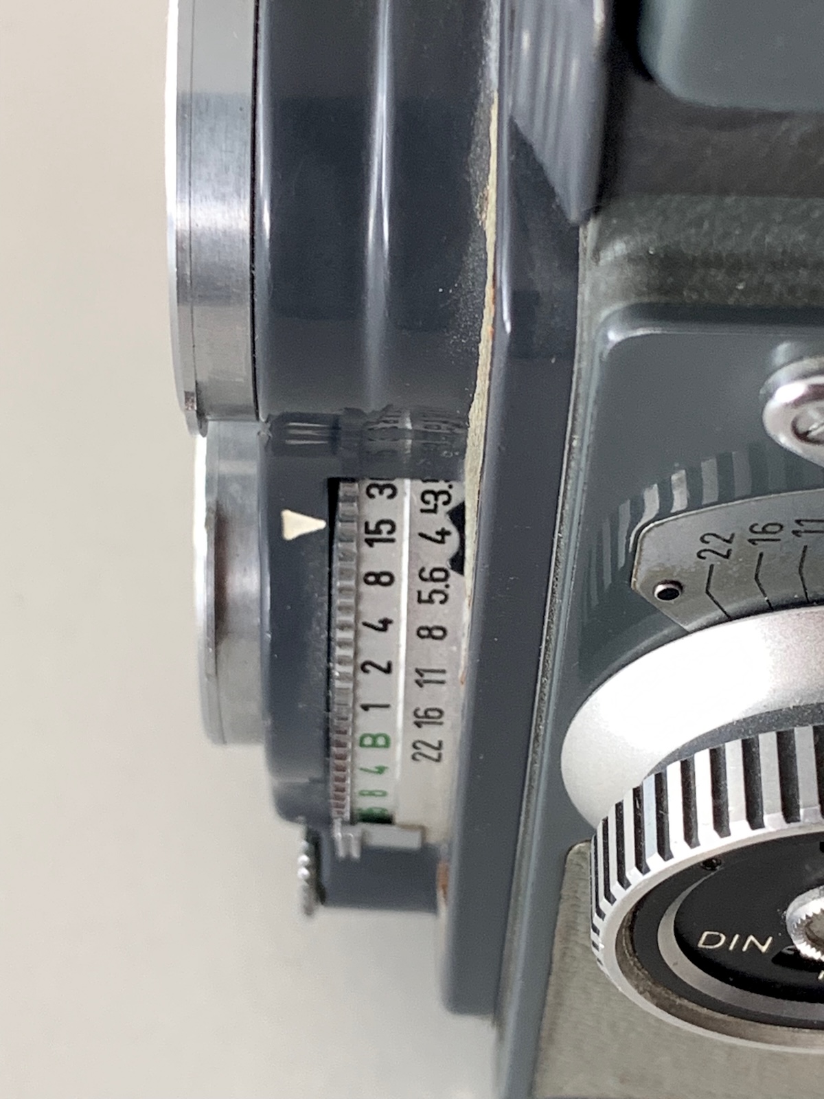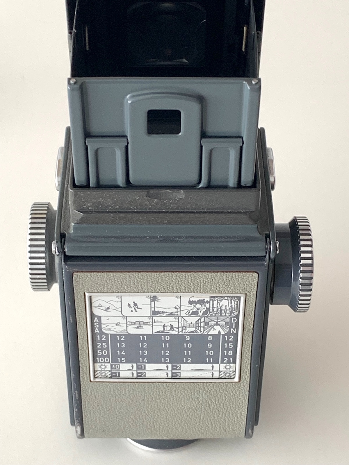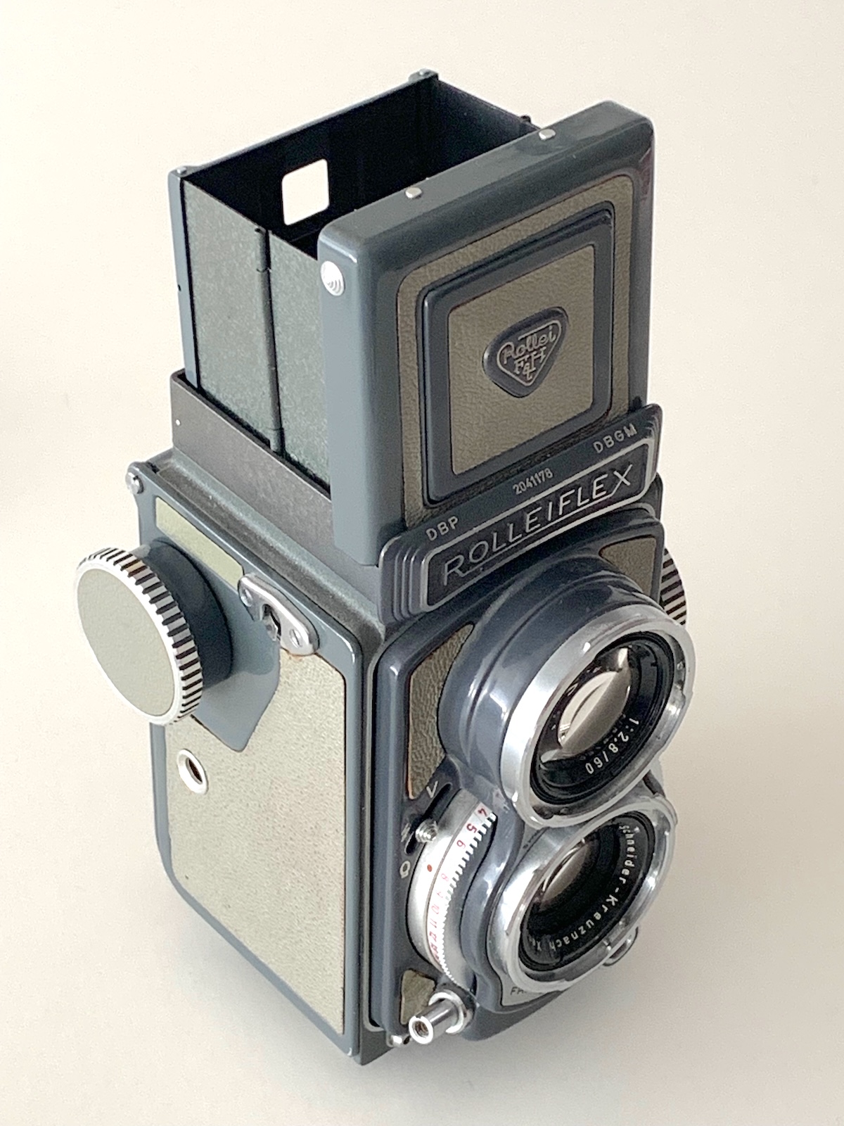 Das Aufnahmeobjektiv ist ein Schneider Xenar 3,5/60; die höhere Lichtstärke der Vorkriegsmodelle hat man aufgegeben; nur das Sucher-Triplet ist ein 2,8/60. Die Objektive sind mit einem Bajonett der Größe I ausgestattet. Wegen des geringen Objektivabstands passen die Streulichtblenden der 6x6-Kameras nicht; F & H bot eine entsprechend angepasste Blende an (ich habe sie gerade nicht gefunden), die auch farblich zum Gehäuse passt: Denn die Baby-Rolleiflex war zunächst, dem Zeitgeschmack entsprechend, in einem grünlichen Grau gehalten. In dieser Ausführung war die Kamera sehr erfolgreich; nach Prochnow wurden im Zeitraum Juli 1957 bis April 1963 insgesamt 62.250 Stück gebaut; der Preis betrug 355 DM. Das Interesse am Format 4x4 und an der grauen Farbe ließ später nach; ab Mai 1963 wurde noch eine Serie in traditioneller schwarzer Farbe gebaut, allerdings nur 4.930 Stück und zum höheren Preis von 434 DM; diese Ausführung ist heute entsprechend selten.