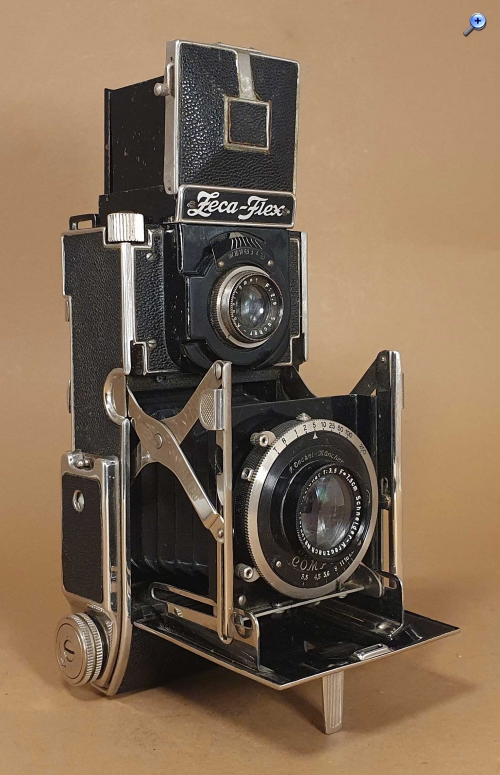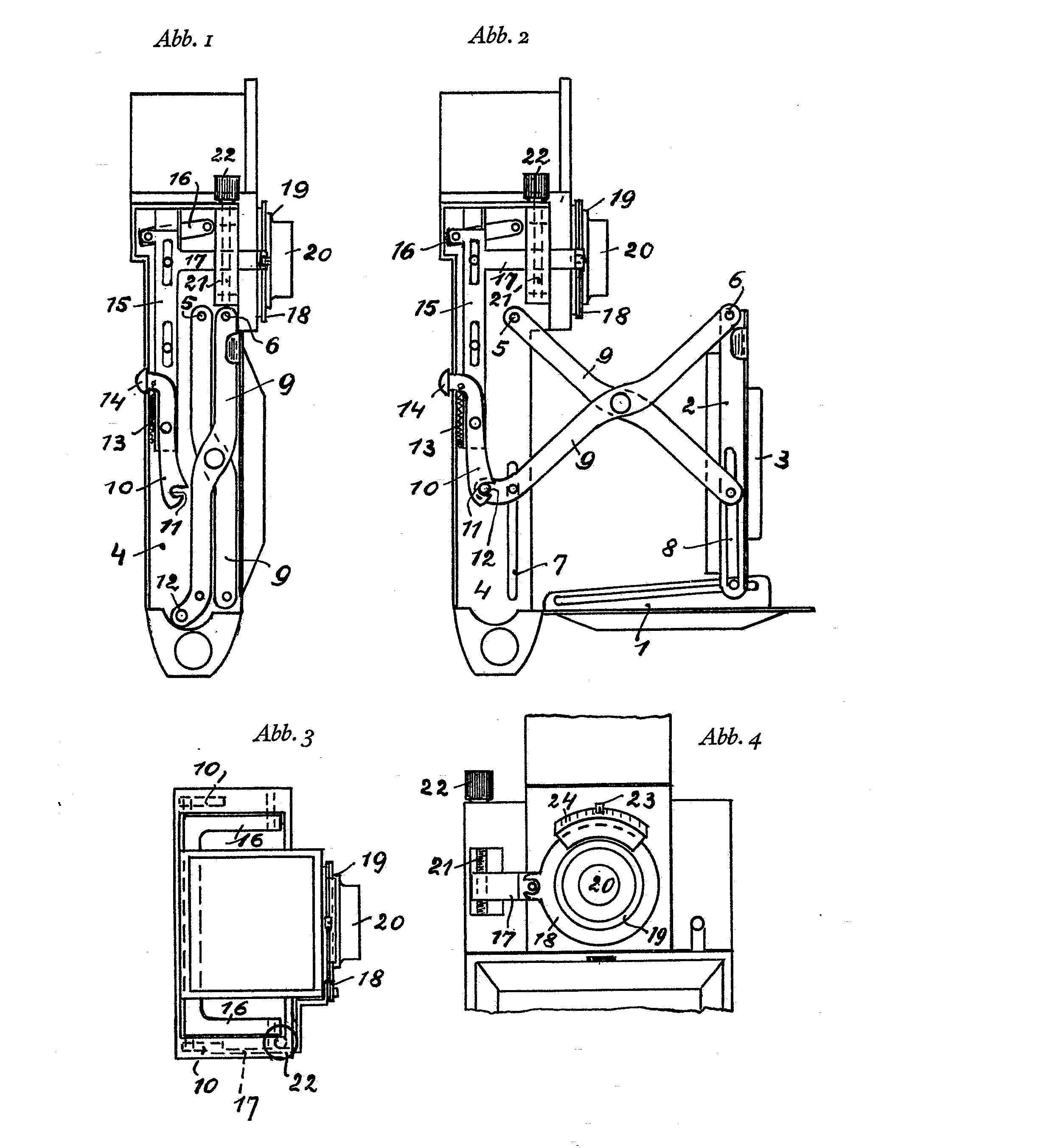 Ein wesentlicher Unterschied der Zeca-Flex zu den bereits vorgestellten faltbaren TLRs ist, dass das das Sucherobjektiv nicht in die faltbare Konstruktion mit einbezogen wurde, faltbar ist lediglich die Konstruktion des Aufnahmeobjektivs. Um die Kamera trotzdem einigermaßen kompakt zu halten, hat Ernst Zeh die Mattscheibe bzw. das Sucherbild auf 3,5 x 3,5 cm verkleinert. Die Spreizen des Faltmechanismus erinnert nicht zufälligerweise an die kleine Zeca-Goldi, vielmehr hat Ernst Zeh seine gesetzlich geschützte Konstruktion der Goldi auf die Zeca-Flex übertragen und entsprechend angepasst. Die notwendigen Anpassungen betreffen in erster Linie die Kopplung zwischen dem Aufnahme- und dem Sucherobjektiv, um ein Fokussieren über die Mattscheibe gewährleisten zu können. In der obigen Patenzeichnung ist diese Kopplung recht gut zu erkennen.