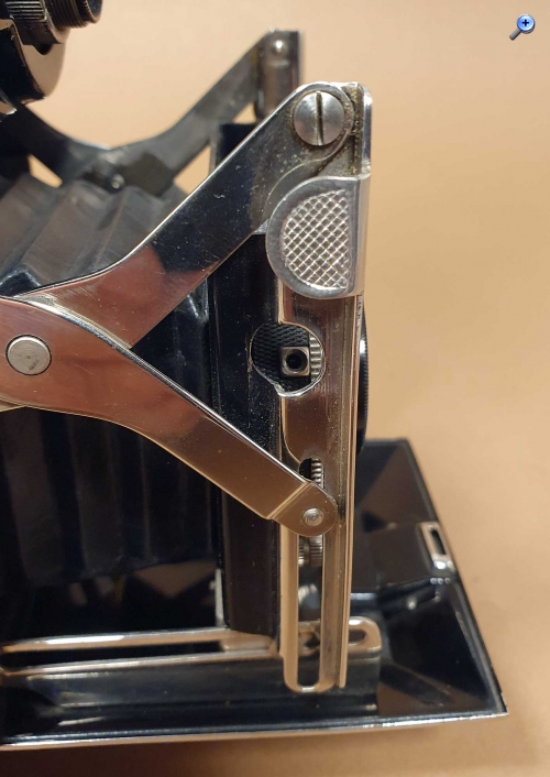 Fokussiert wird mittels eines Triebknopfes, der direkt neben der Mattscheibe angeordnet ist. Auf den ersten Blick schien mir diese Konstruktion etwas fummelig, aber beim Test erwies sie sich als durchaus praktikabel. Der Triebknopf ist leichtgängig und kann bequem mit einem Finger bedient werden. Das Mattscheibenbild ist mit 3,5 x 3,5 cm recht klein und leider auch recht dunkel. Selbst mit ausgeklappter Sucherlupe fiel mir das genaue Fokussieren schwer. Die Entfernungsskala (beim hier gezeigten Exemplar in feet) über dem Sucherobjektiv ist meinem Empfinden nach ungünstig platziert, denn zum Ablesen muss man die Kamera erst drehen.