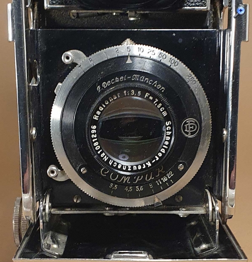 Meine Zeca-Flex ist mit einem Schneider-Kreuznach Radionar 3.5/75,5 cm im Compur-Verschluss bestückt, was wohl die preiswerteste Ausstattungsvariante darstellt. Weiter Ausstattungsvarianten sind Xenar 3.5, Tessar 3.5 und am begehrtesten wohl Xenar 2.8 jeweils im Compur-Rapid-Veschluss. Die Zeca-Flex verfügt (wie die anderen drei genannten faltbaren TLRs) nicht über einen Gehäuseauslöser – ausgelöst wir direkt am Verschluss.