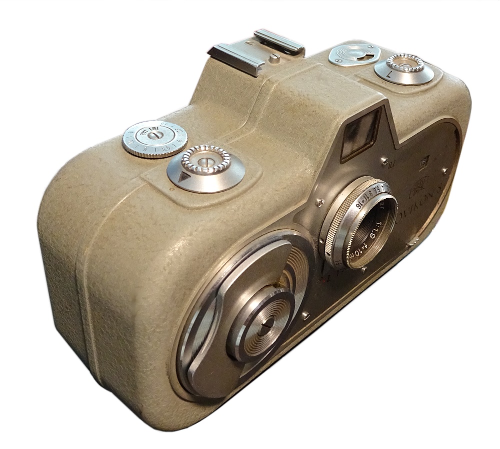 eine besondere Schmalfilmkamera, da hier die beiden Filmrollen quer zum Bildfenster lagen. Dadurch sieht die Kamera eher wie ein Fotoapparat aus. Die Kamera war damals durchaus eine Sensation und damit ein Meilenstein der Schmalfilmkamera-Geschichte.