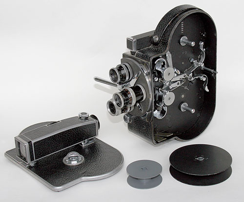 Sonstiges: Rückspulkurbel (über die ganze Filmlänge), Meterzählwerk bis 30 m, Einzelbildzählwerk bis 2000 Bilder, Sektorenblende nicht verstellbar, automatische Filmeinfädelung, Stativgewinde 3/8". Kein Belichtungsmesser eingebaut. Anbaumöglichkeit für Elektromotor.