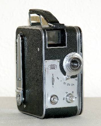 Baujahr 1939 Format: 8mm Normalschmalfilm in Kassette Objektiv: C. Zeiss Jena 2279021 1:2 f= 1 cm Entfernungseinstellung: o,25 m bis unendlich Blenden 2 bis 16 Aufnahmegeschwindigkeit: 8, 16, 24 und 64 Bilder pro Sekunde sowie Umschaltung auf Einzelbildaufnahme Sonstiges: Televorsatz mit Brennweitenverlängerung auf 2,5 cm war in Vorbereitung, Parallaxe-Ausgleich,, Filter-Verwendung, Selbstauslöser durch Drahtauslöser Sucher: Durchsichtsucher Filmtransport: Mechanisches Aufziehfederwerk Besonderheiten: Möglichkeit, durch einen Kassettenwechsel verschiedenes Filmmaterial wechselweise zu benutzen