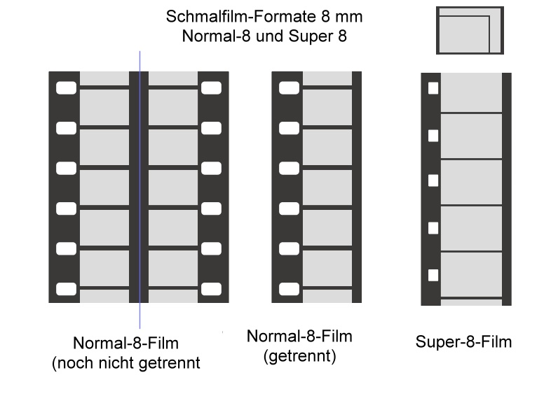 Beider Filmhälften? Ja, denn der Normal-8-Film war ja doppelt so breit wie das Normal-8-Format. Somit wurde zuerst die eine Hälfte durch die Kamera gezogen. Dann wurde die Filmrolle umgedreht, wieder eingelegt und nunmehr die andere Hälfte belichtet. Im Entwicklungslabor wurde die Filmrolle anschließend in der Mitte durchschnitten und dann richtig aneinander geklebt. (Normal-8 und Doppel-8 meint das selbe. Genau genommen wird der Doppel-8 Film erst nach der Längstrennung zum Normal-8-Film.)