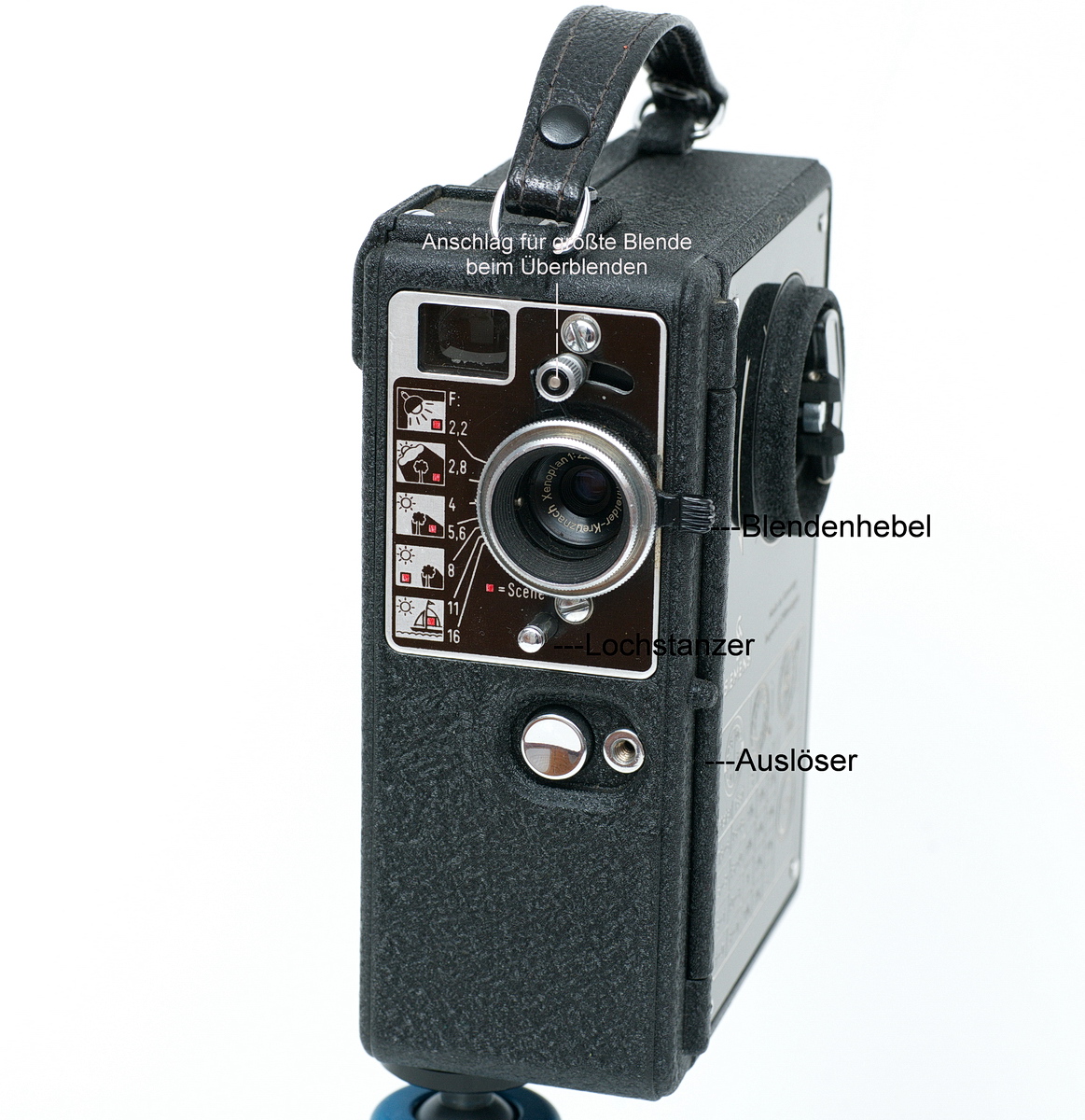 Besonderheiten: Überblendung möglich, allerdings kann die Blende nur auf kleinsten Wert f/16 geschlossen werden. Sonstiges: Szenenmarkierer, Stativgewinde, Trage-Riemengriff