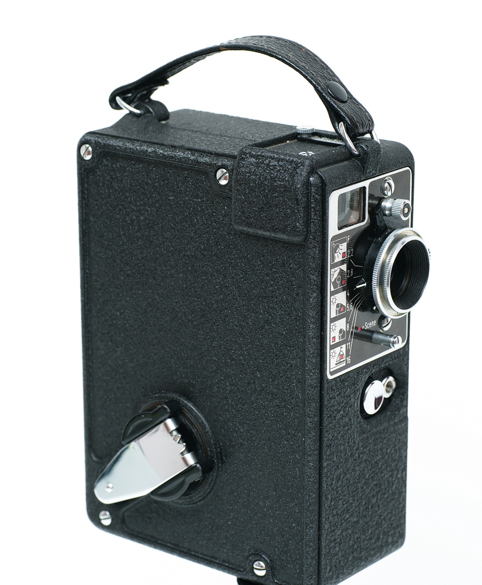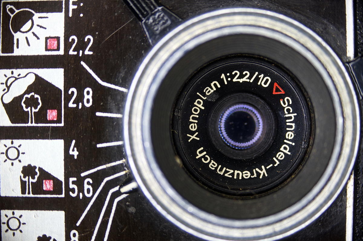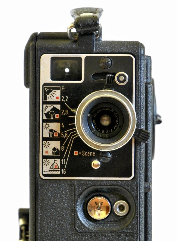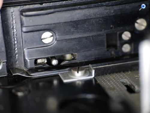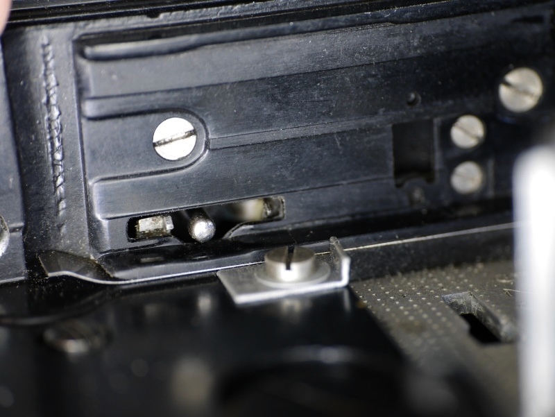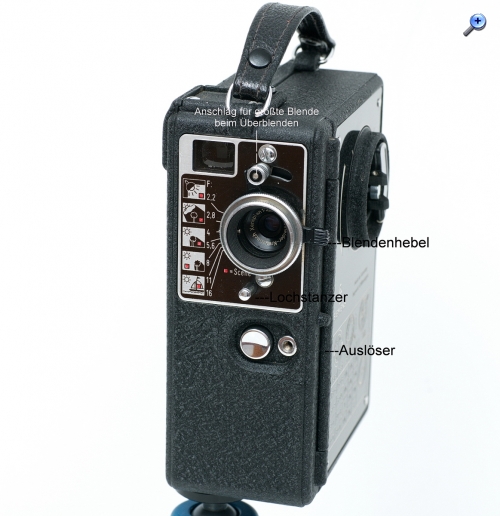 Der Knopf unter dem Objektiv ist der Filmfreigabeknopf, er muss beim Rückwickeln gedrückt und gehalten werden. Er sperrt das Laufwerk und hebt der Film aus dem Greifer und Sperrgreifer, sodass der Film, nachdem er gestrafft worden ist, auf die Vorratsspule zurückgewickelt werden kann.