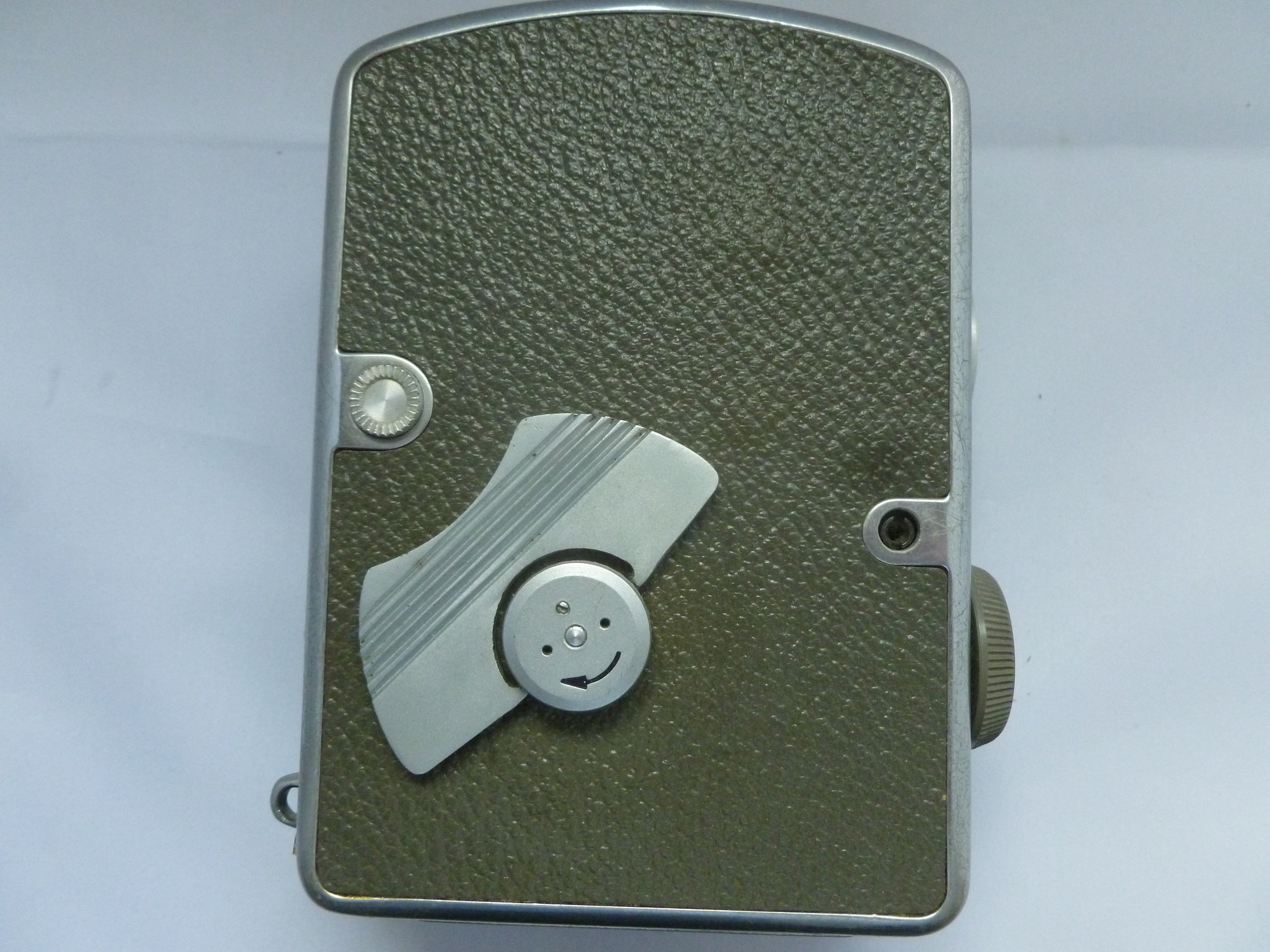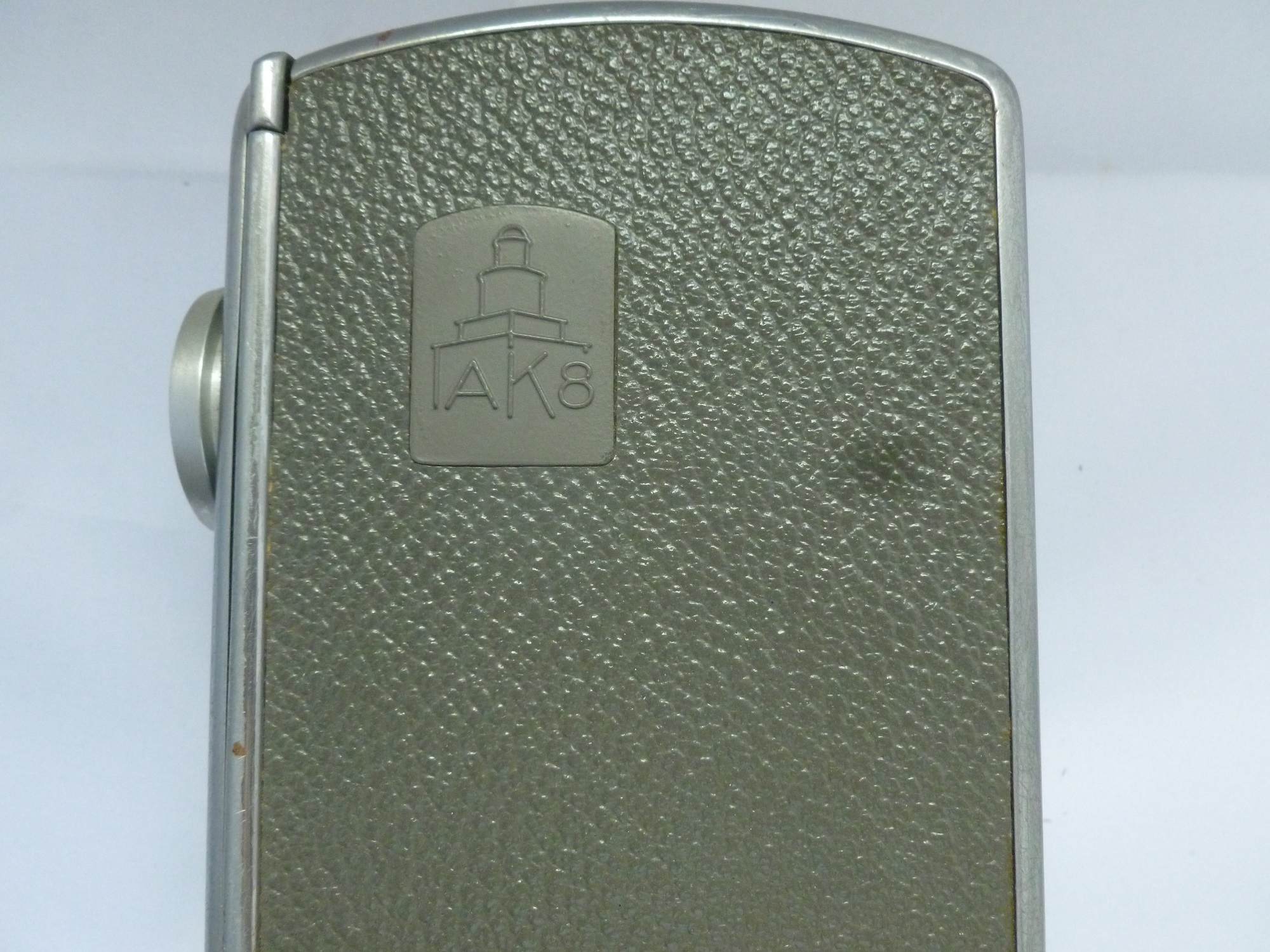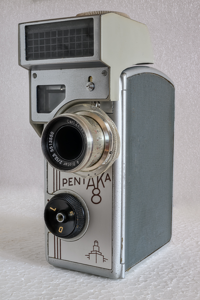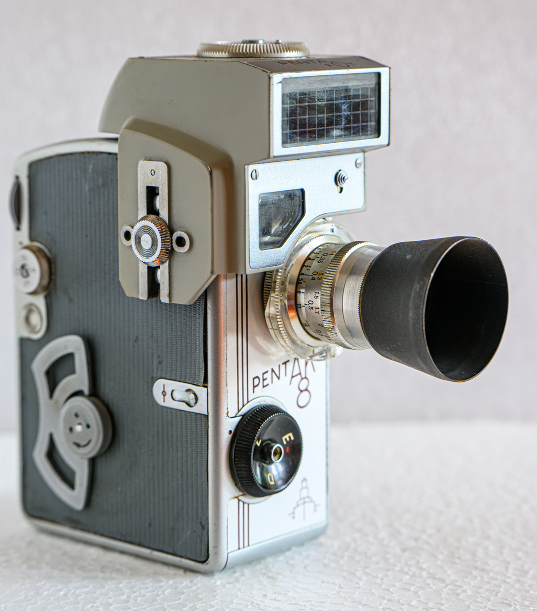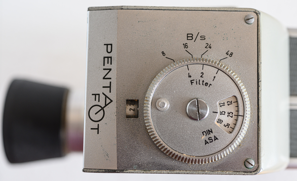 Mein Exemplar hat außerdem noch den PENTAFOT Belichtungsmesseraufsatz. Hiermit konnte während des Filmens die Blende bei wechselnden Lichtverhältnissen geregelt werden. Die Übertragung des Blendenwertes vom Objektiv zur Messeinrichtung erfolgte über eine Kurvenscheibe aus Kunststoff, die vorher auf den Blendenring des Objektives angebracht wurde und von der Abtastrolle des PENTAFOT gelesen werden konnte. Über die Anzeige im Sucher konnte man dann an einem Nachführzeiger die Blende entsprechend regeln. Eine Urform der Halbautomatik, für die man aber am besten drei Hände brauchte. Der PENTAFOT war der Nachfolger des auch für die AK8 erhältlichen ABEFOT. Mit dem PENTAFOT sieht die PENTAKA 8 richtig "bullig" aus.