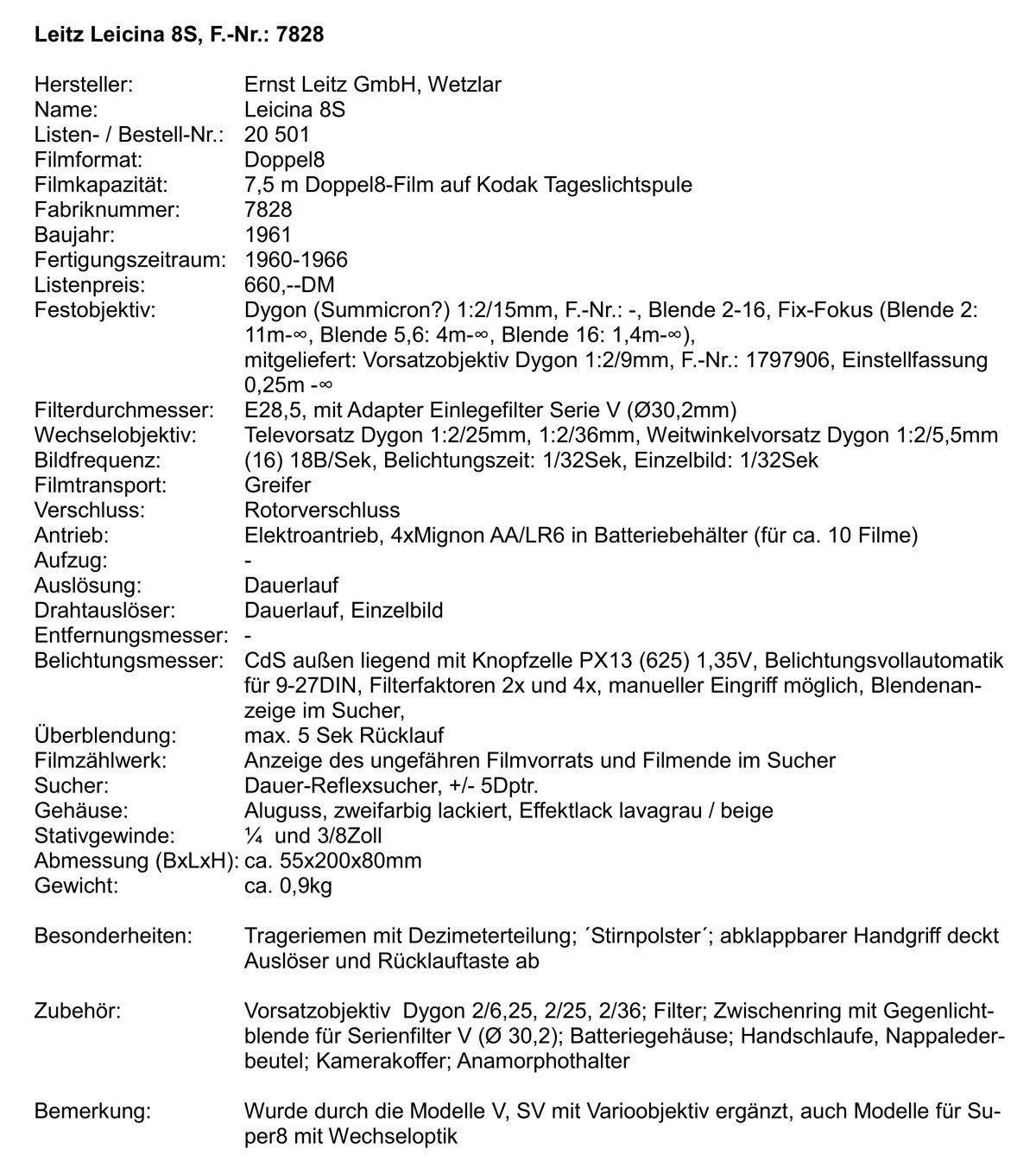 Hallo im Forum! Nach dem Tod von Oskar Barnak zeigte Leitz in Deutschland wenig Interesse an der Entwicklung von Filmkameras. 1960 überraschte Leitz die Filmwelt mit einer einfachen Doppel8-Kamera für 7,5mTageslichtspulen, die sich gegen nationale und internationale Konkurrenz durchsetzen musste. Ein Massenprodukt mit Erfolgsgeschichte, es sollen insgesamt über 30000 Kameras hergestellt worden sein. Es war die erste Kamera einer Modellreihe, von der hier vorgestellten einfachen Normal8-Kamera ´Leicina 8S´ bis zur halbprofessionellen Super8-Kamera ´Leicina Spezial´ mit Wechseloptik.