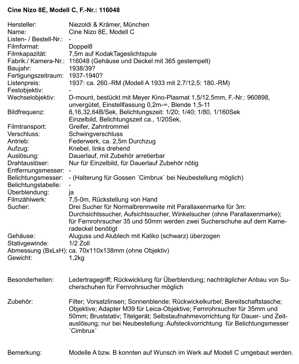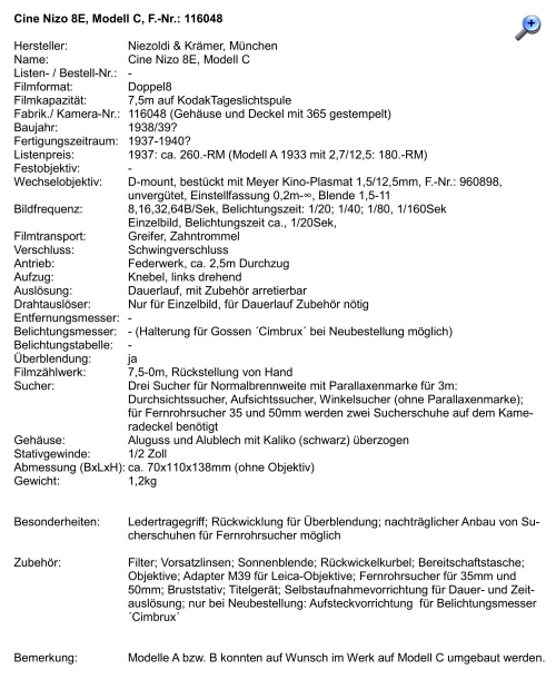 In Europa hatte sich der 1922/23 vorgestellte 9,5mm-Film als günstige Alternative zum 16mm-Format etabliert, der 8mm-Film wurde nur zögerlich aufgenommen. Ditmar in Österreich und Niezoldi & Krämer in Deutschland erkannten das Potential des neuen Formates, 1933 präsentierte Niezoldi & Krämer die erste Doppel8-Kamera in Europa, die ´Cine Nizo 8E´, die später den Zusatz ´Modell A´bekam. Es folgte 1936 das Modell B mit Einzelbildschaltung, Selbstaufnahmevorrichtung (Dauer- und Zeitauslösung) und 1937 das hier vorgestellte Modell C mit einer zusätzlichen Rückwickeleinrichtung für Überblendungen.