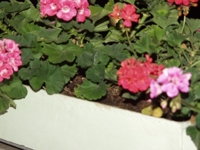 Die nächtliche Weitaufnahme ohne Blitz ist schon schwierig hinsichtlich des Verwackelns. Mache doch noch mal am Tag mit einem Stativ und SElbstauslöser eine Aufnahme des Blumenkastens mit und ohne Makro.